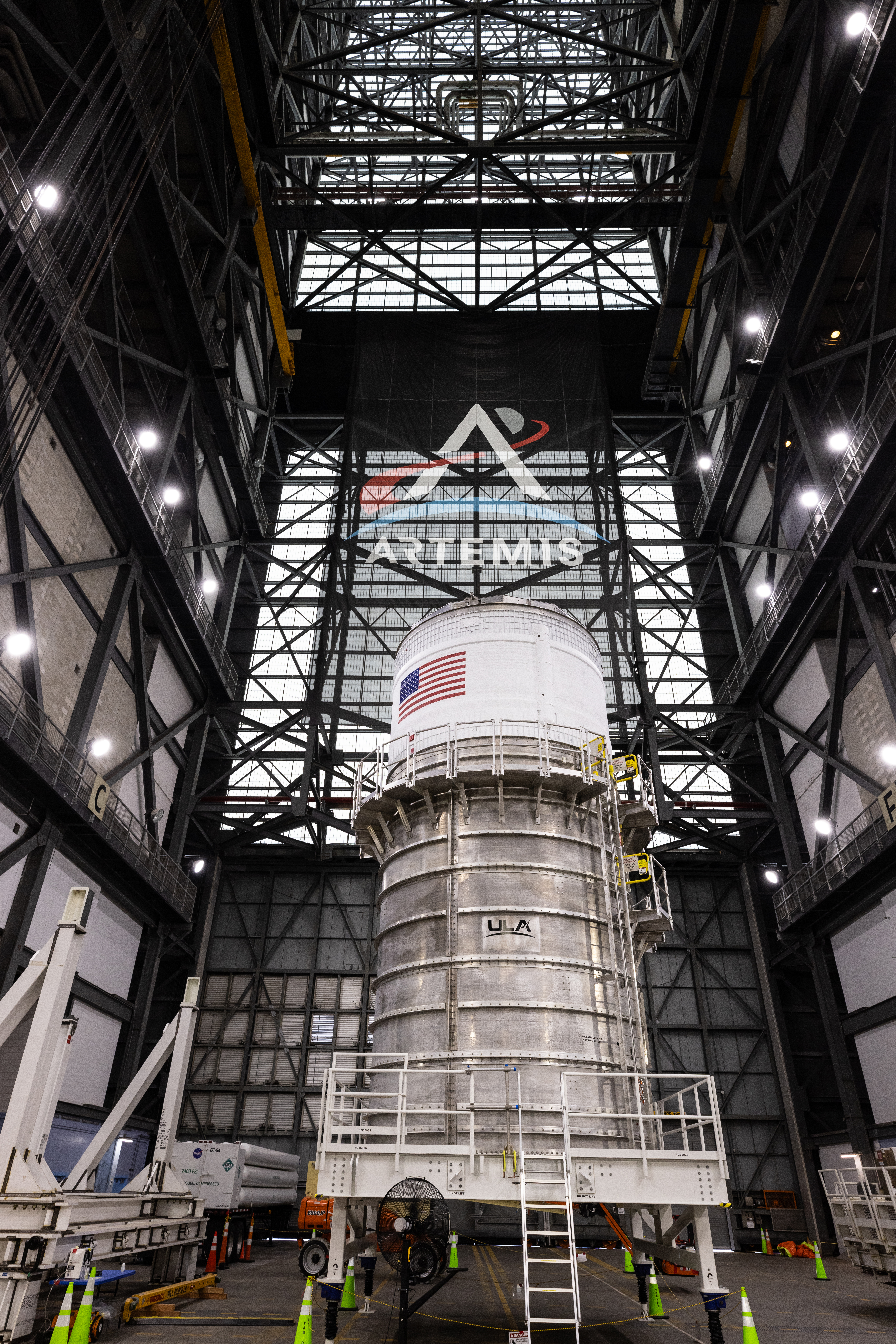 The upper stage for NASA’s Artemis II SLS (Space Launch System) rocket sits in the transfer aisle of the Vehicle Assembly Building at NASA’s Kennedy Space Center in Florida on Wednesday, April 16, 2025, after teams with the agency’s Exploration Ground Systems Program transported the four-story propulsion system from the spaceport’s Multi-Payload Processing Facility (MPPF). Technicians fueled the SLS upper stage, known as the interim cryogenic propulsion stage, with hydrazine for its reaction control system at the MPPF and will now integrate the four-story propulsion system with SLS rocket elements atop mobile launcher 1.