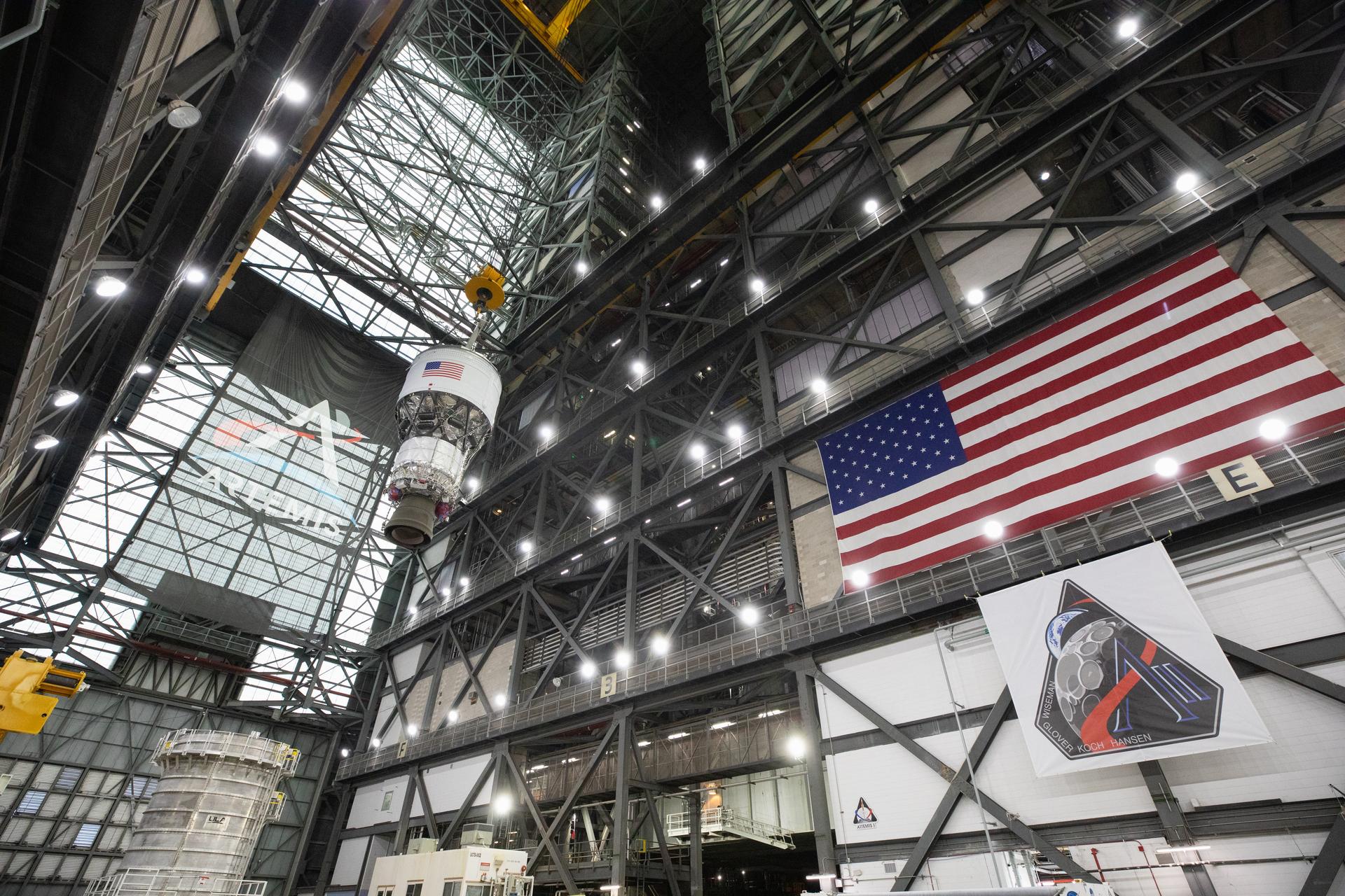 Teams with NASA’s Exploration Ground Systems Program begin integrating the interim cryogenic propulsion stage to the SLS (Space Launch System) launch vehicle stage adapter on Wednesday, April 30, 2025, inside the Vehicle Assembly Building at NASA’s Kennedy Space Center in Florida. The four-story propulsion system, built by Boeing and ULA (United Launch Alliance), is powered by an RL10 engine that will enable the Orion spacecraft to build up enough speed for the push toward the Moon during the Artemis II crewed test flight.