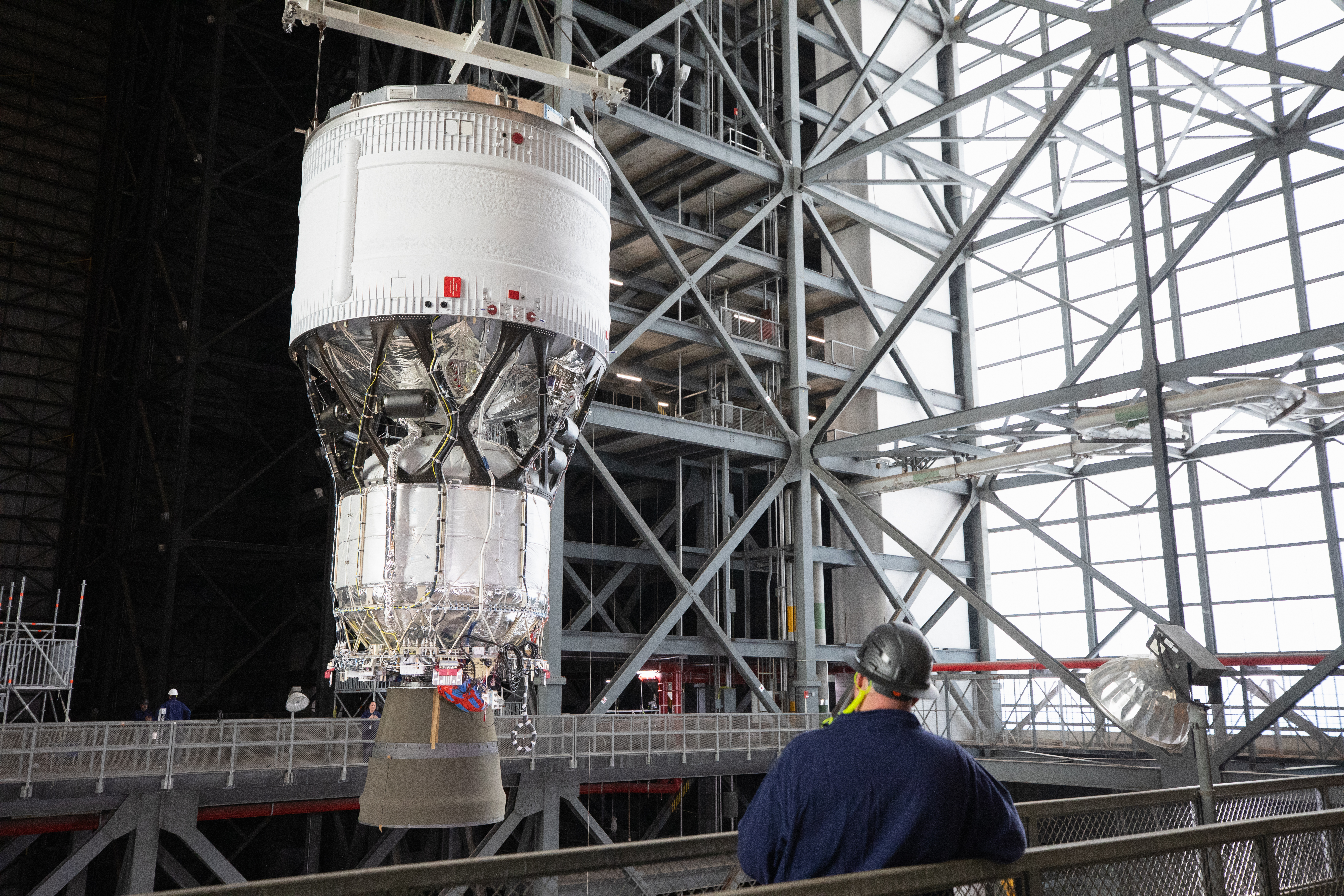Teams with NASA’s Exploration Ground Systems Program begin integrating the interim cryogenic propulsion stage to the SLS (Space Launch System) launch vehicle stage adapter on Wednesday, April 30, 2025, inside the Vehicle Assembly Building at NASA’s Kennedy Space Center in Florida. The four-story propulsion system, built by Boeing and ULA (United Launch Alliance), is powered by an RL10 engine that will enable the Orion spacecraft to build up enough speed for the push toward the Moon during the Artemis II crewed test flight.