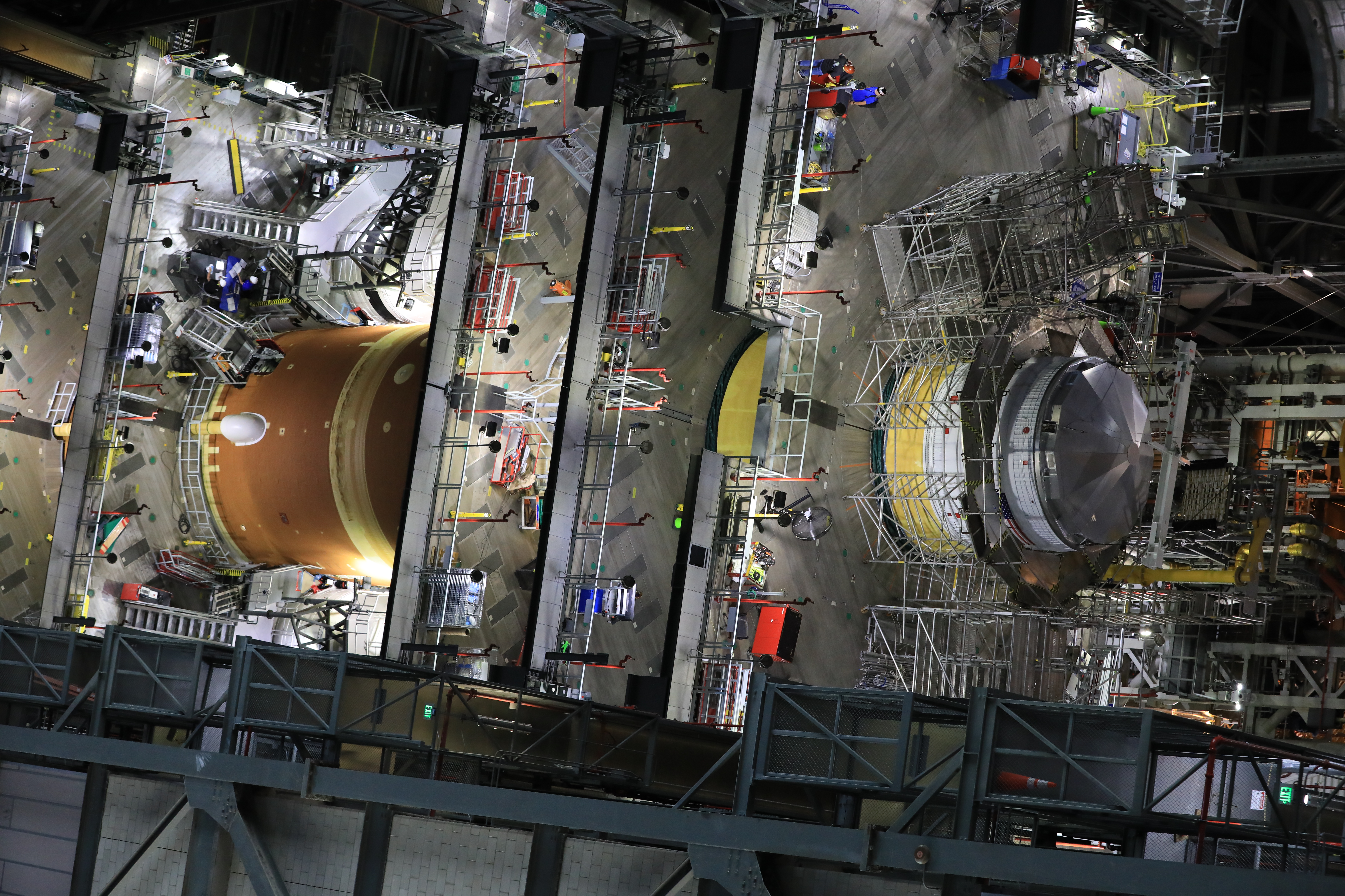 Teams with NASA’s Exploration Ground Systems Program finish integrating the interim cryogenic propulsion stage to the SLS (Space Launch System) launch vehicle stage adapter on Thursday, May 1, 2025, inside the Vehicle Assembly Building at NASA’s Kennedy Space Center in Florida. The four-story propulsion system, built by Boeing and ULA (United Launch Alliance), is powered by an RL10 engine that will enable the Orion spacecraft to build up enough speed for the push toward the Moon during the Artemis II crewed test flight.