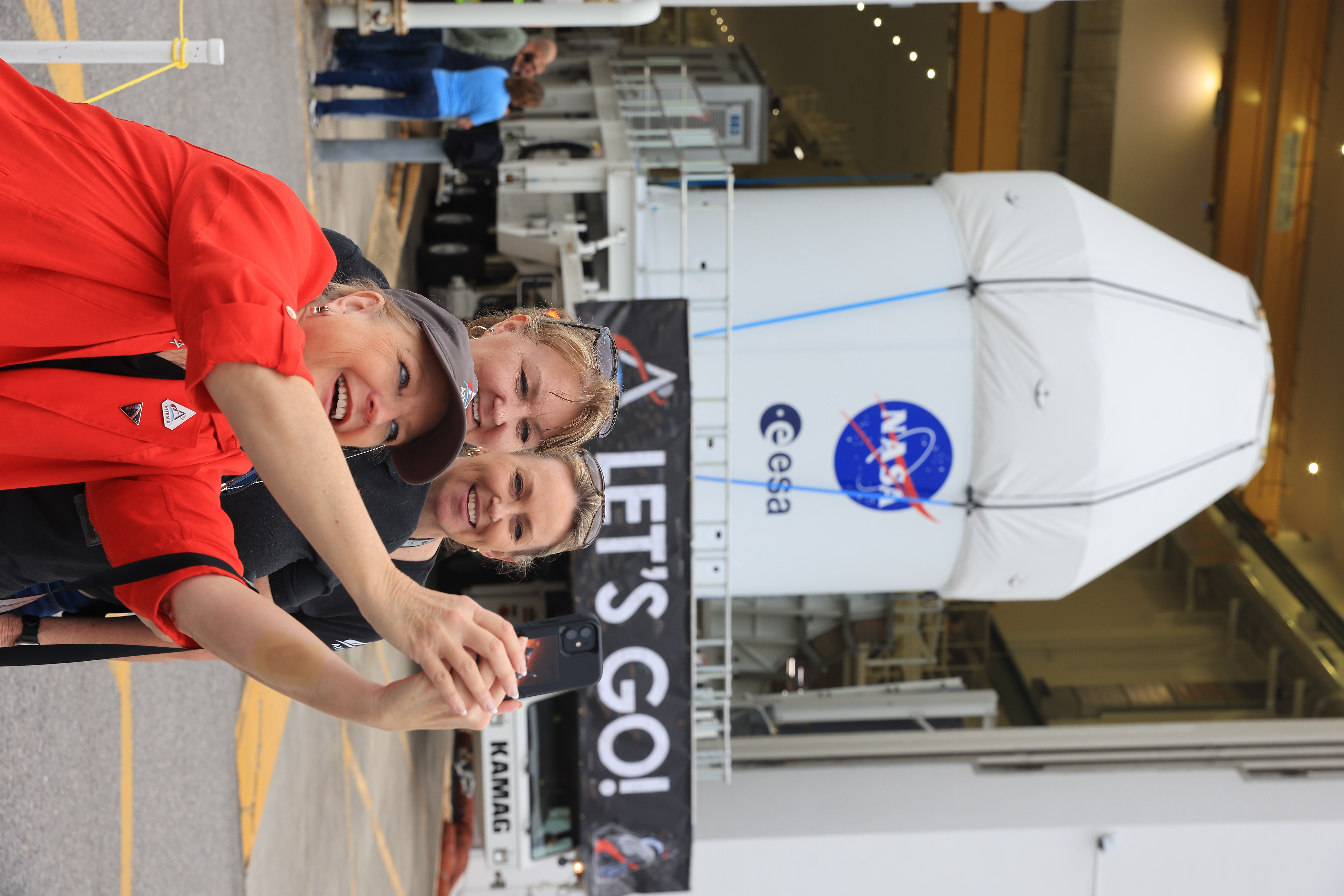 NASA’s KAMAG transporter carries the agency’s Artemis II Orion spacecraft from the Neil A. Armstrong Operations and Checkout Building to the Multi-Payload Processing Facility at Kennedy Space Center in Florida on Saturday, May 3, 2025. The Orion spacecraft will undergo fueling and processing operations at the Multi-Function Facility. The Artemis II test flight is the first crewed flight under NASA’s Artemis campaign and is another step toward missions on the lunar surface and helping the agency prepare for future human missions to Mars.