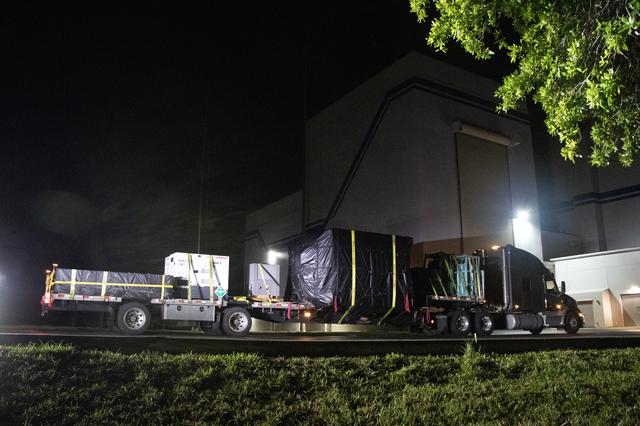 The transport carrier containing NASA’s IMAP (Interstellar Mapping and Acceleration Probe) arrives Saturday, May 10, 2025 at the Astrotech Space Operations Facility near the agency’s Kennedy Space Center in Florida where it will undergo checkout operations, fueling, and encapsulation. IMAP will study how the Sun shapes the boundaries of the heliosphere, the bubble protecting around our solar system. IMAP is targeting launch this fall aboard a SpaceX Falcon 9 rocket from Launch Complex 39A at NASA Kennedy.