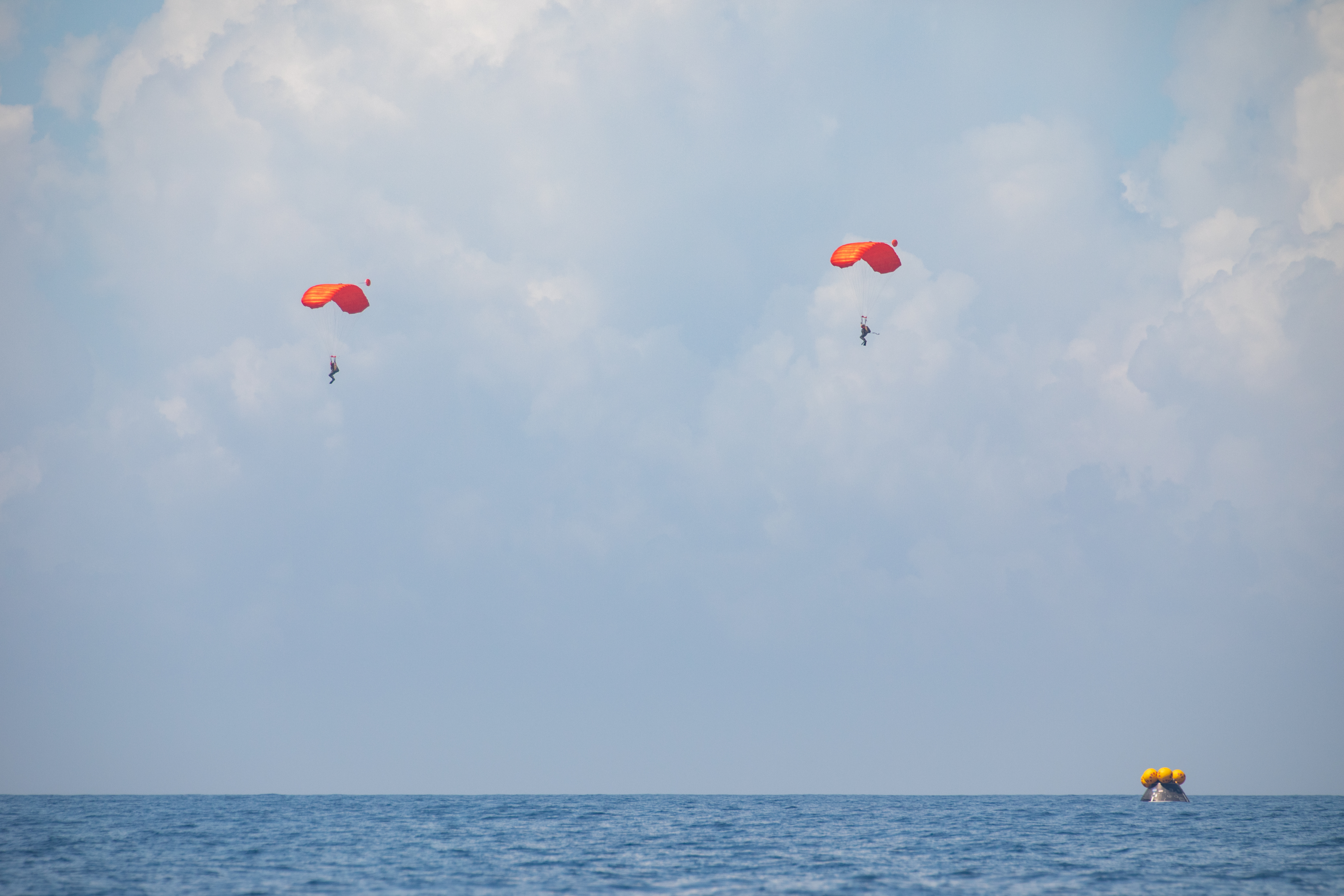 Teams with NASA and the Department of Defense (DoD) rehearse recovery procedures for an ascent abort scenario off the coast of Florida near the agency’s Kennedy Space Center on Thursday, June 12, 2025. Utilizing mannequin crew members inside the Crew Module Test Article (CMTA) – a full-scale mockup of the Orion spacecraft – the simulations practiced abort timelines and joint NASA and DoD recovery procedures supported by Artemis II launch and flight control teams, as NASA prepares to send four astronauts around the Moon and back next year as part of the agency’s first crewed Artemis mission.
