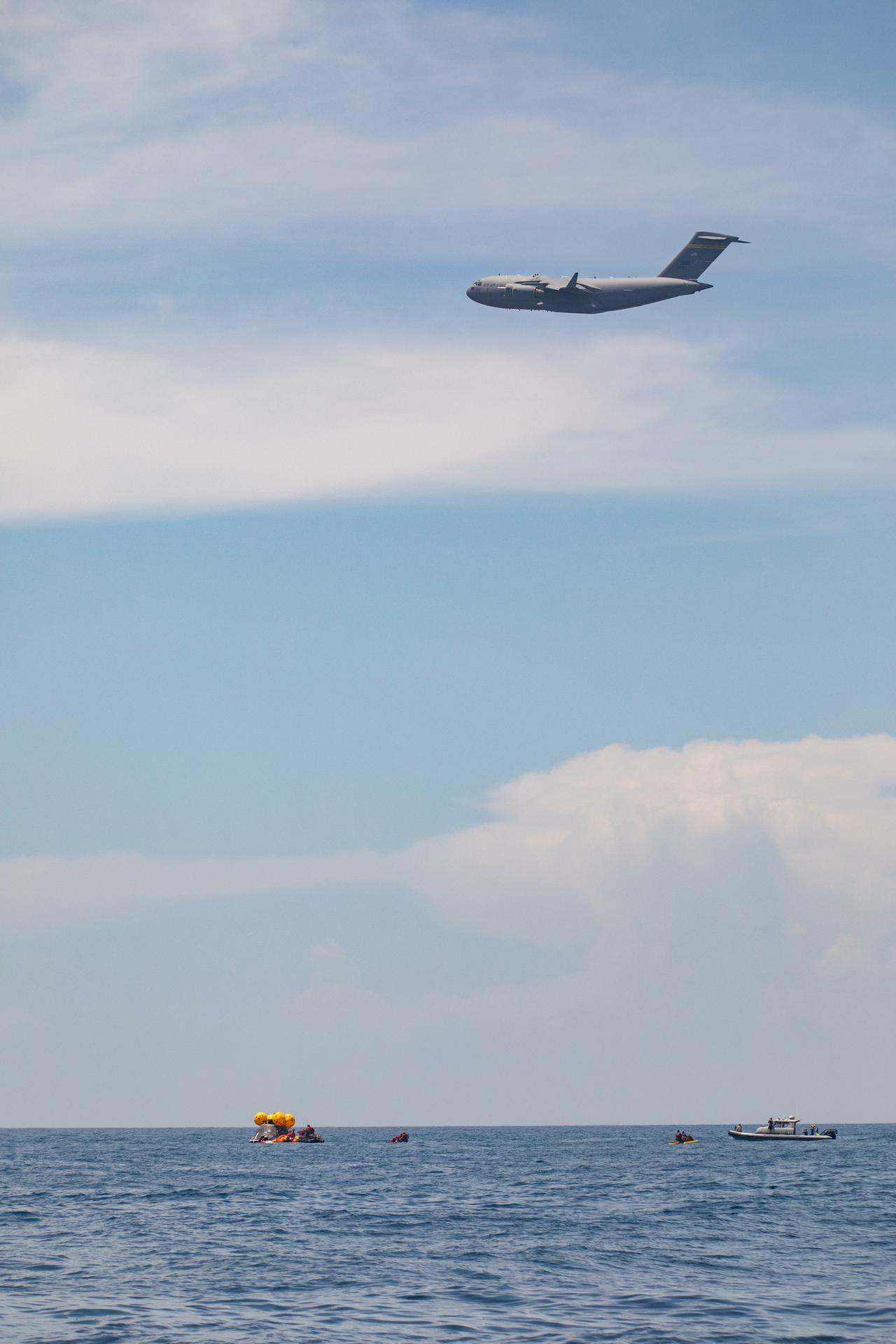 Teams with NASA and the Department of Defense (DoD) rehearse recovery procedures for an ascent abort scenario off the coast of Florida near the agency’s Kennedy Space Center on Thursday, June 12, 2025. Utilizing mannequin crew members inside the Crew Module Test Article (CMTA) – a full-scale mockup of the Orion spacecraft – the simulations practiced abort timelines and joint NASA and DoD recovery procedures supported by Artemis II launch and flight control teams, as NASA prepares to send four astronauts around the Moon and back next year as part of the agency’s first crewed Artemis mission.