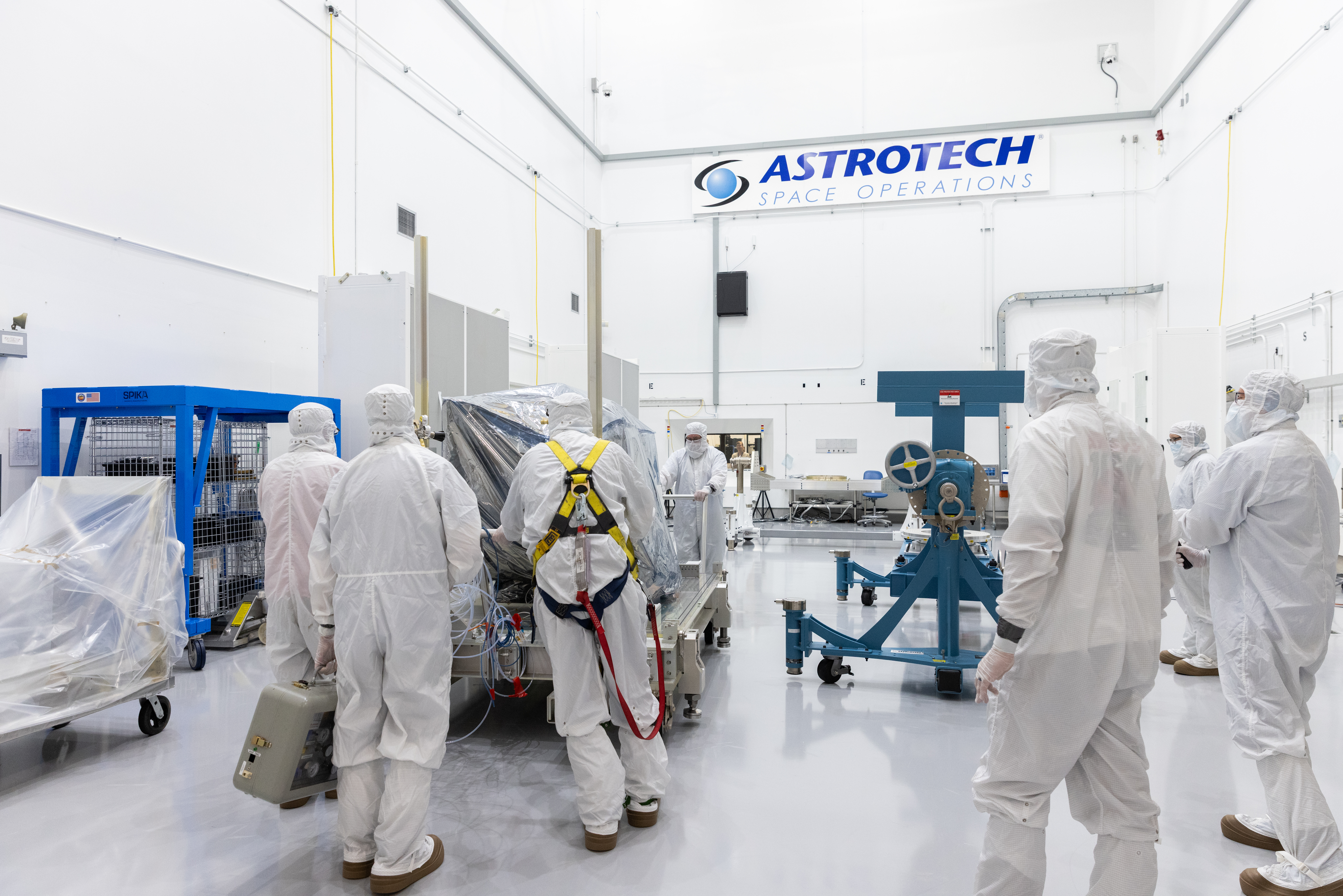 Technicians remove the protective casing covering NASA’s Carruthers Geocorona Observatory on Monday, July 21, 2025, at the Astrotech Space Operations Facility near the agency’s Kennedy Space Center in Florida. The Carruthers Geocorona Observatory is a small satellite set to operate at Lagrange Point 1 (L1), an orbit point between the Earth and Sun about one million miles away. Carruthers will use its ultraviolet cameras to monitor how space weather from the Sun impacts the exosphere, the outermost part of Earth’s atmosphere. The observatory will launch as a rideshare with NASA’s (Interstellar Mapping and Acceleration Probe) no earlier than September 2025.