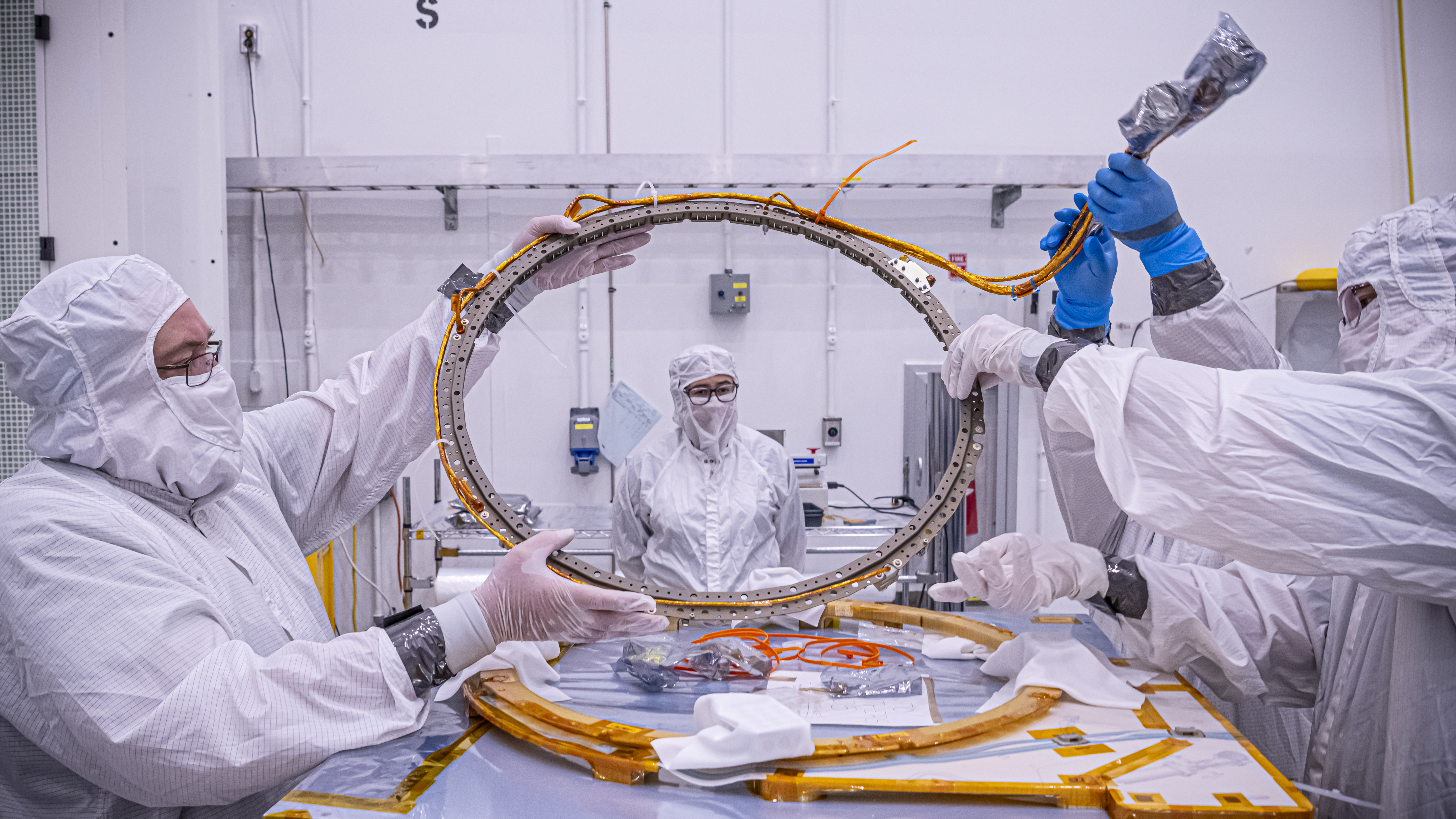 Technicians inspect a motorized light band for NASA’s Carruthers Geocorona Observatory on Tuesday, July 22, 2025, at the Astrotech Space Operations Facility near the agency’s Kennedy Space Center in Florida. The Carruthers Geocorona Observatory is a small satellite set to operate at Lagrange Point 1 (L1), an orbit point between the Earth and Sun about one million miles away. Carruthers will use its ultraviolet cameras to monitor how space weather from the Sun impacts the exosphere, the outermost part of Earth’s atmosphere. The observatory will launch as a rideshare with NASA’s IMAP (Interstellar Mapping and Acceleration Probe) no earlier than September 2025.