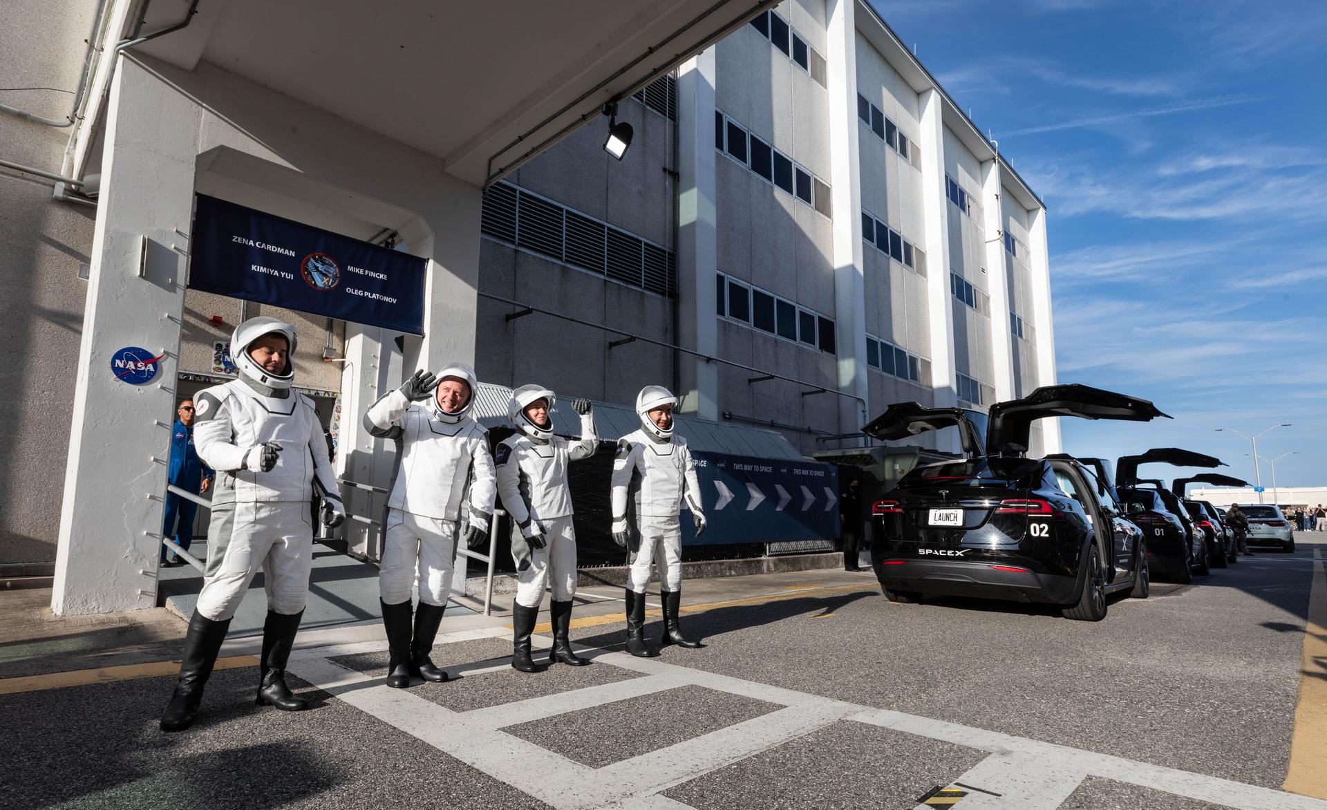 From right to left, JAXA (Japan Aerospace Exploration Agency) astronaut Kimiya Yui, NASA astronauts Zena Cardman and Mike Fincke, along with and Roscosmos cosmonaut Oleg Platonov wave to family and friends as they walk out of the Neil A. Armstrong Operations and Checkout Building at the agency’s Kennedy Space Center in Florida during the second launch attempt of NASA’s SpaceX Crew-11 mission to the International Space Station on Friday, Aug. 1, 2025. Crew-11 is scheduled to lift off aboard SpaceX’s Dragon spacecraft and Falcon 9 rocket at 11:43 a.m. EDT, from Launch Complex 39A at NASA Kennedy.