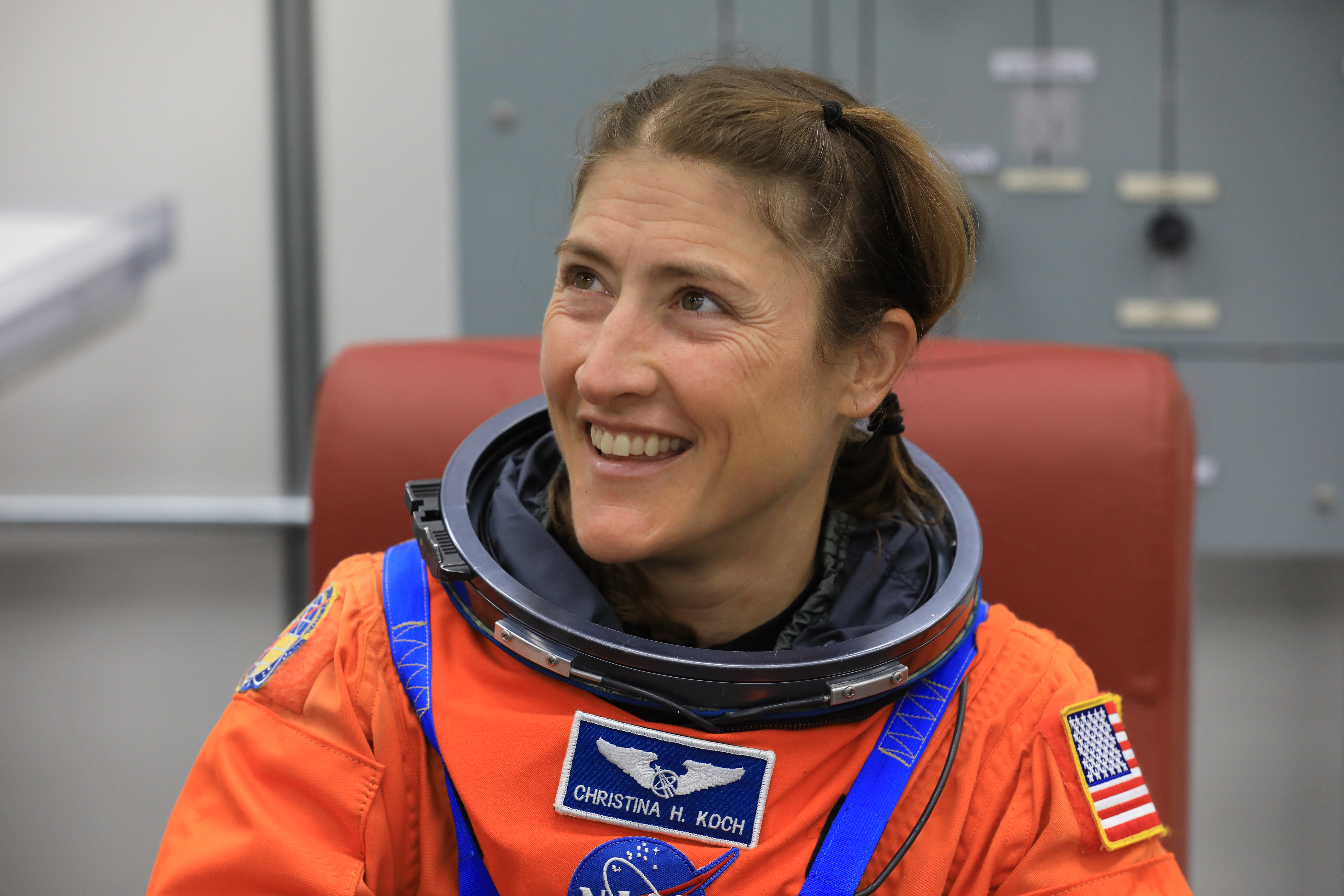 NASA astronaut Christina Koch, Artemis II mission specialist, smiles during suit-up operations inside the Neil A. Armstrong Operations and Checkout Building at NASA’s Kennedy Space Center in Florida on Monday, Aug. 11, 2025. During a two-day operation, the Artemis II team practiced night-run demonstrations of different launch day scenarios like suit-up operations, walk-out, and arriving at the launch pad for the Artemis II test flight. Through the Artemis campaign, NASA will send astronauts to explore the Moon for scientific discovery, economic benefits, and to build the foundation for the first crewed missions to Mars – for the benefit of all.