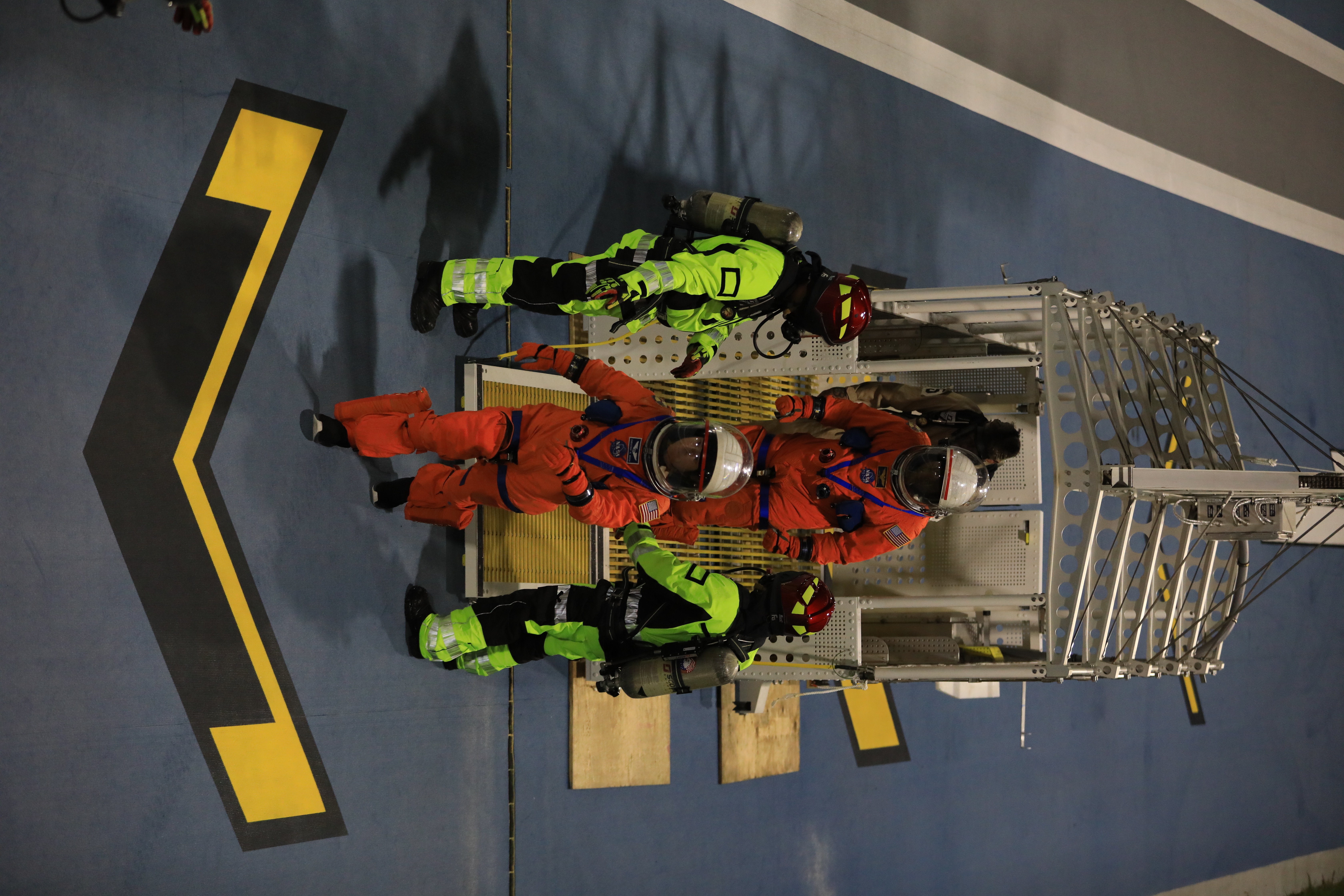 NASA astronauts Christina Koch, Artemis II mission specialist and Victor Glover, Artemis II pilot, practice walking out of an emergency egress basket at Launch Complex 39B at NASA’s Kennedy Space Center in Florida on Tuesday, Aug. 12, 2025. The baskets, similar to gondolas on ski lifts, are used in the case of an unlikely emergency during launch countdown to enable astronauts and other pad personnel to quickly escape from the mobile launcher to the base of the pad where waiting emergency transport vehicles will drive them away. During a two-day operation, the Artemis II team practiced night-run demonstrations of different launch day scenarios for the Artemis II test flight.
