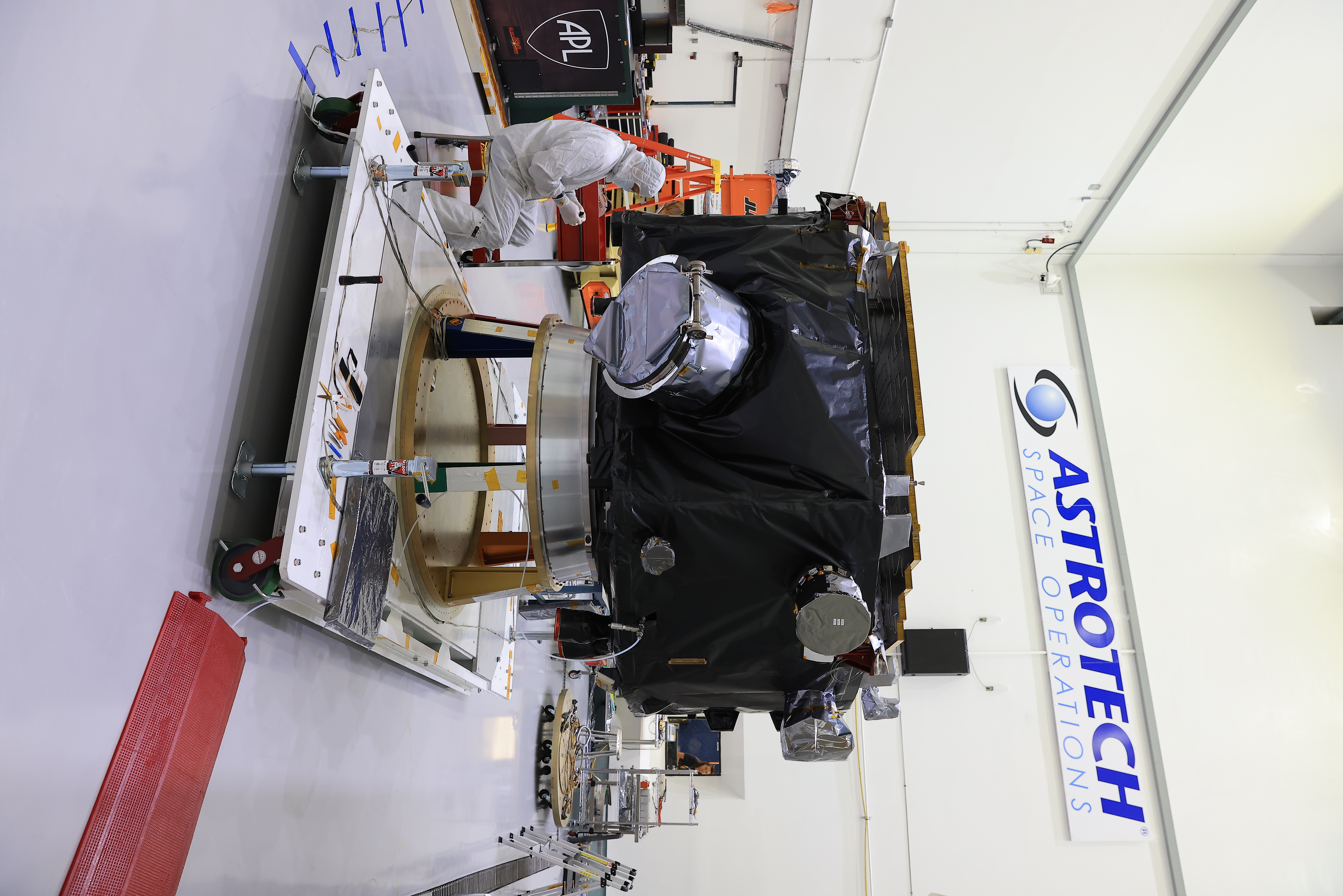 Technicians inspect NASA’s IMAP (Interstellar Mapping and Acceleration Probe) spacecraft on a spacecraft dolly inside Astrotech Space Operations Facility near the agency’s Kennedy Space Center in Florida during a NASA-hosted media day on Thursday, Aug. 28, 2025. IMAP and its two rideshares – NASA’s Carruthers Geocorona Observatory and National Oceanic and Atmospheric Administration’s (NOAA) Space Weather Follow On–Lagrange 1 (SWFO-L1) observatory – will orbit the Sun near Lagrange point 1, about one million miles from Earth, where IMAP will scan the heliosphere, a huge bubble created by the Sun’s wind that encapsulates our entire solar system, and analyze the composition of charged particles, and investigate how those particles move through the solar system.