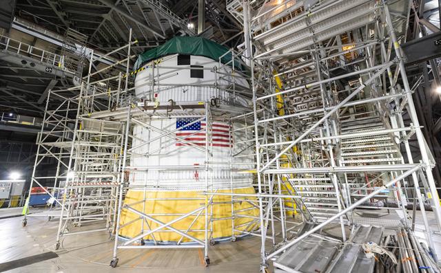 Technicians with NASA’s Exploration Ground Systems Program attach the Orion stage adapter to the interim cryogenic propulsion stage atop the agency’s SLS (Space Launch System) Moon rocket inside Vehicle Assembly Building at NASA’s Kennedy Space Center on Wednesday, Sept. 30, 2025. During the Artemis II test flight, the Orion stage adapter separates from the interim cryogenic propulsion stage, deploying four science payloads into high-Earth orbit. Up next, the Orion spacecraft and its launch abort system will stack atop the Orion stage adapter to complete integration and prepare for the launch of four astronauts around the Moon and back in early 2026.