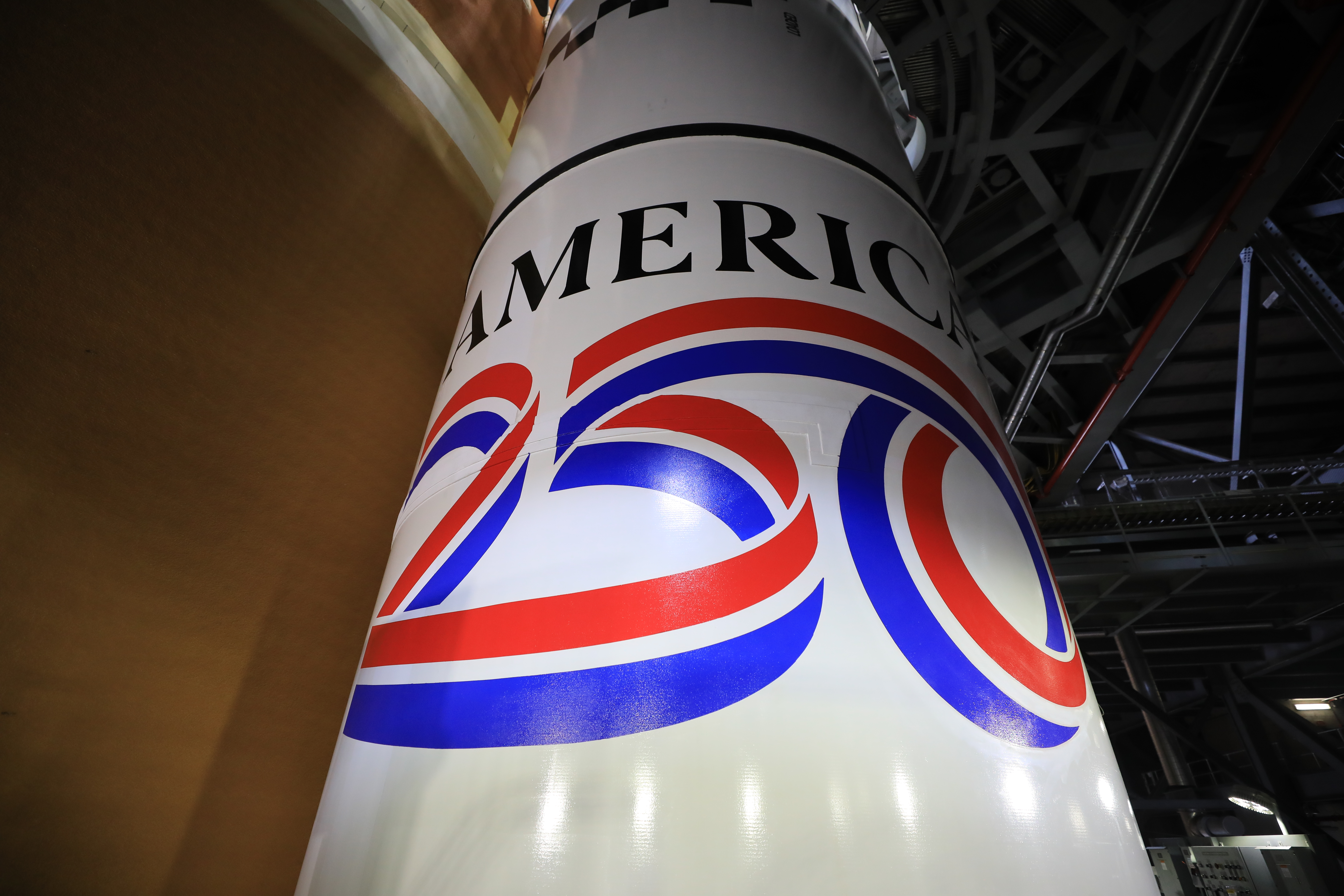Technicians with NASA’s Exploration Ground Systems unveil on Monday, Dec. 1, 2025, the America 250 logo on the twin SLS (Space Launch System) solid rocket boosters for the Artemis II mission inside the Vehicle Assembly Building at NASA’s Kennedy Space Center in Florida. The SLS rocket and the Orion spacecraft will carry NASA astronauts Reid Wiseman, Victor Glover, Christina Koch, and CSA (Canadian Space Agency) astronaut Jeremy Hansen on a 10-day mission around the Moon and back in early 2026 from Launch Complex 39B at NASA Kennedy. America 250 commemorates the 250th anniversary of the signing of the Declaration of Independence with NASA celebrating the “Spirit of Innovation” theme to inspire future generations.