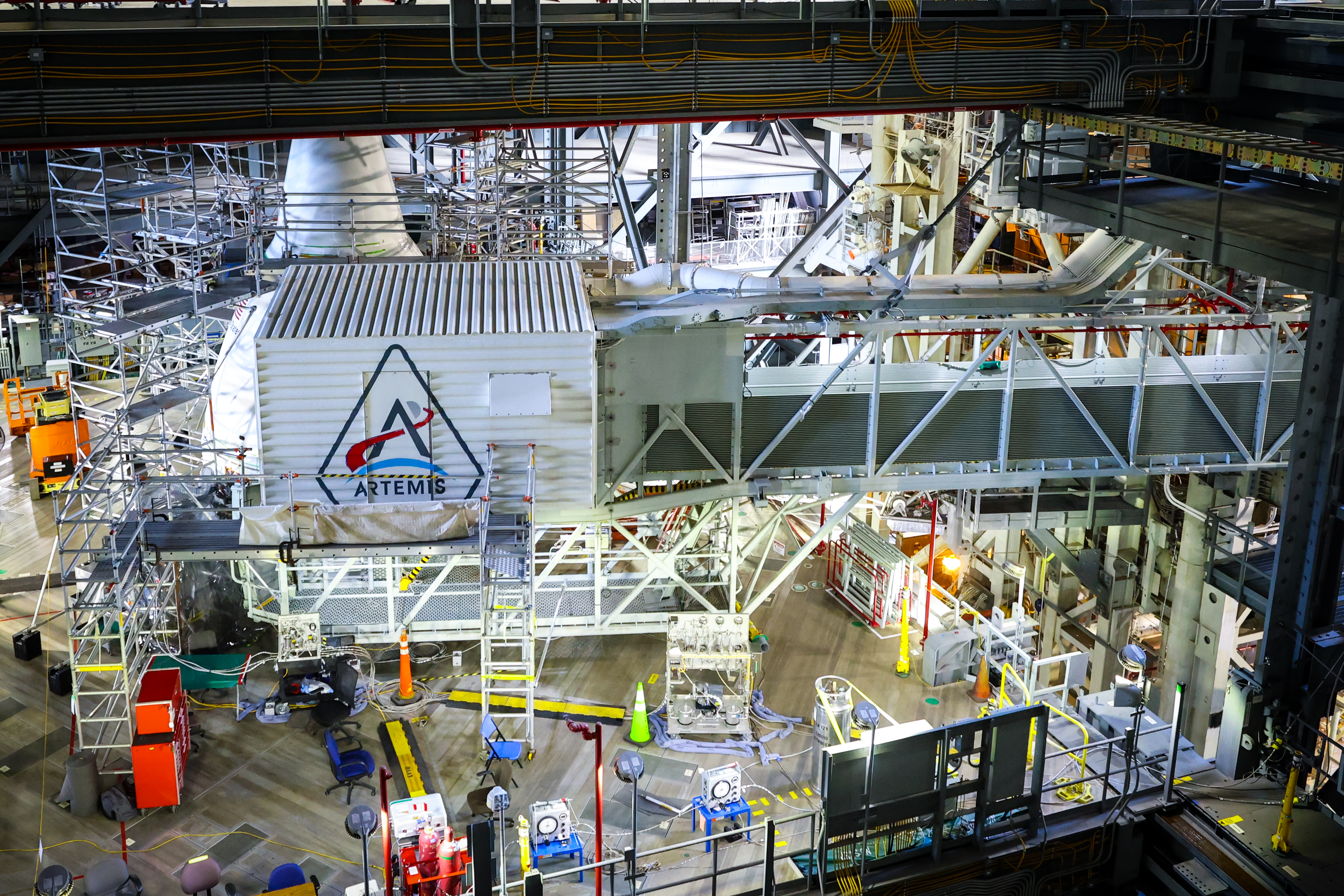 A freshly painted NASA’s Artemis logo is unveiled on the White Room connected to the crew access arm and mobile launcher inside the Vehicle Assembly Building at NASA’s Kennedy Space Center in Florida on Thursday, Dec. 4, 2025. The White Room is the area where the Artemis II crew Reid Wiseman, Victor Glover, Christina Koch, and CSA (Canadian Space Agency) astronaut Jeremy Hansen will enter the Orion spacecraft ahead of launch from Launch Complex 39B at NASA Kennedy in early 2026.