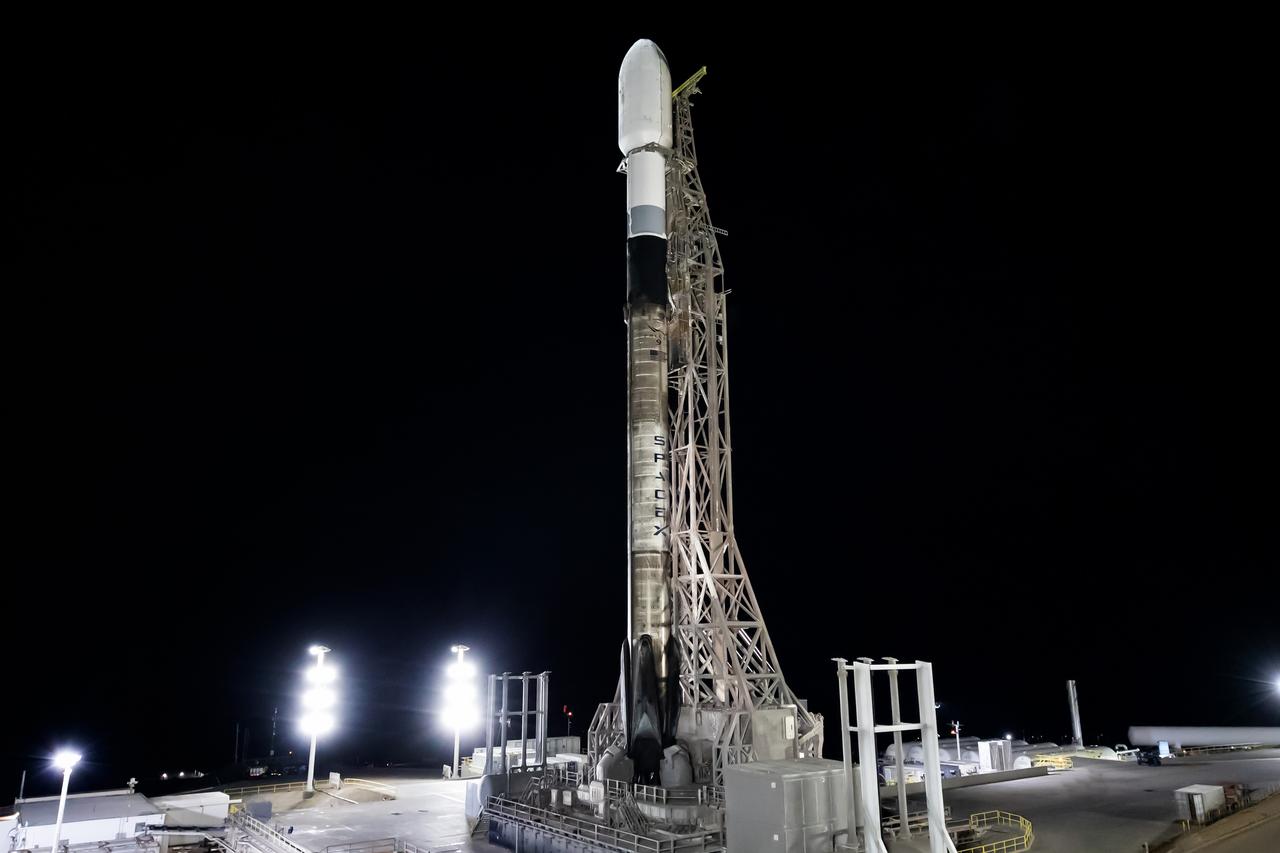 A SpaceX Falcon 9 rocket carrying NASA’s Pandora small satellite, the Star-Planet Activity Research CubeSat (SPARCS), Black Hole Coded Aperture Telescope (BlackCAT) CubeSat, and several other payloads stands vertical on the pad at Space Launch Complex 4 East at Vandenberg Space Force Base in California on Sunday, Jan. 11, 2026, as part of the company’s Twilight mission. Pandora will provide an in-depth study of at least 20 known planets orbiting distant stars to determine the composition of their atmospheres — especially the presence of hazes, clouds, and water. Launch of SpaceX’s Twilight mission is scheduled for 5:44 a.m. PST Jan. 11, from Vandenberg’s Space Launch Complex 4 East.