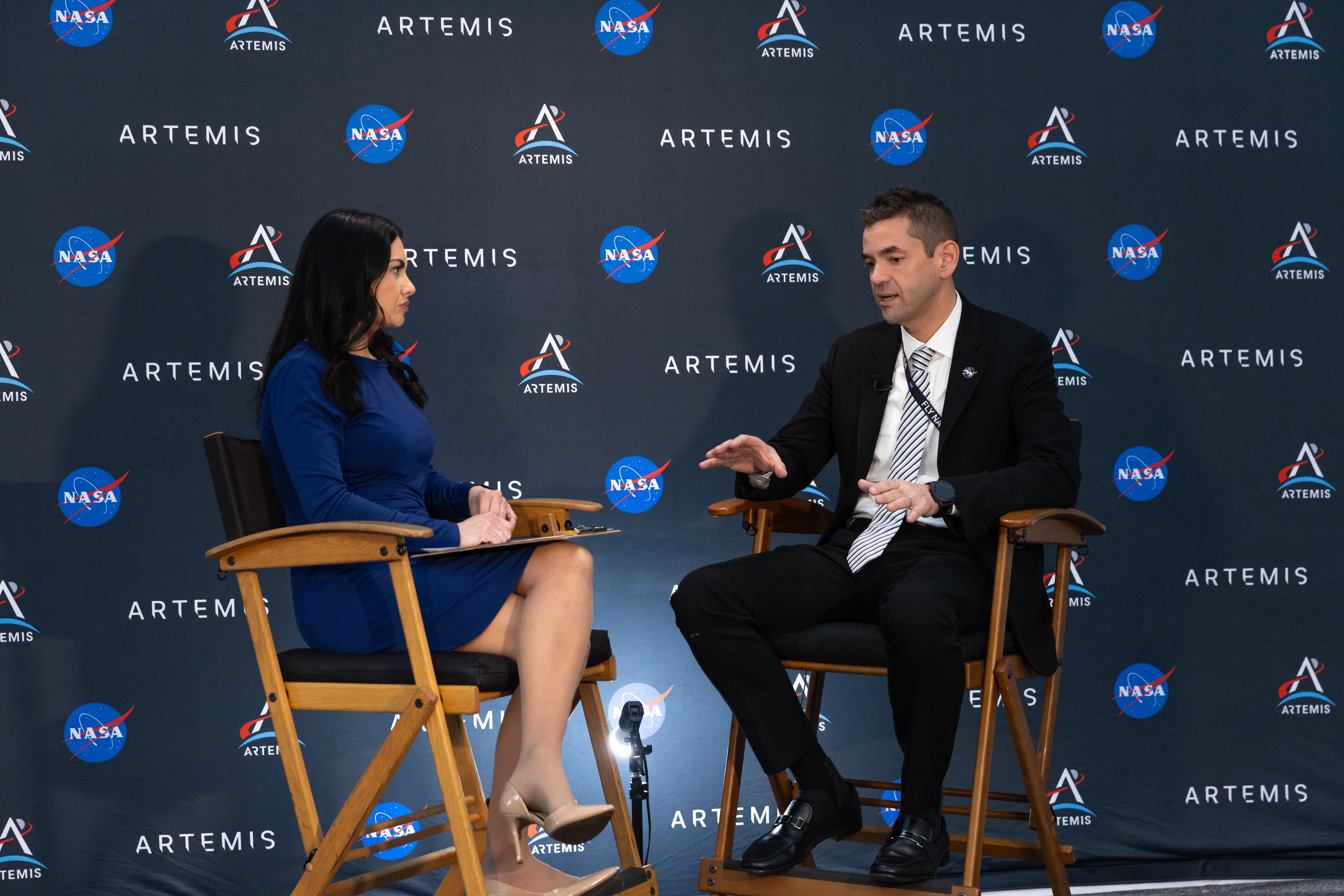 NASA Administrator Jared Isaacman speaks to a member of the media on Tuesday, Jan. 13, 2026, at the NASA News Center at the agency’s Kennedy Space Center in Florida. The newly appointed 15th administrator of the agency outlined his vision for his term including sending humans to the Moon and beyond.