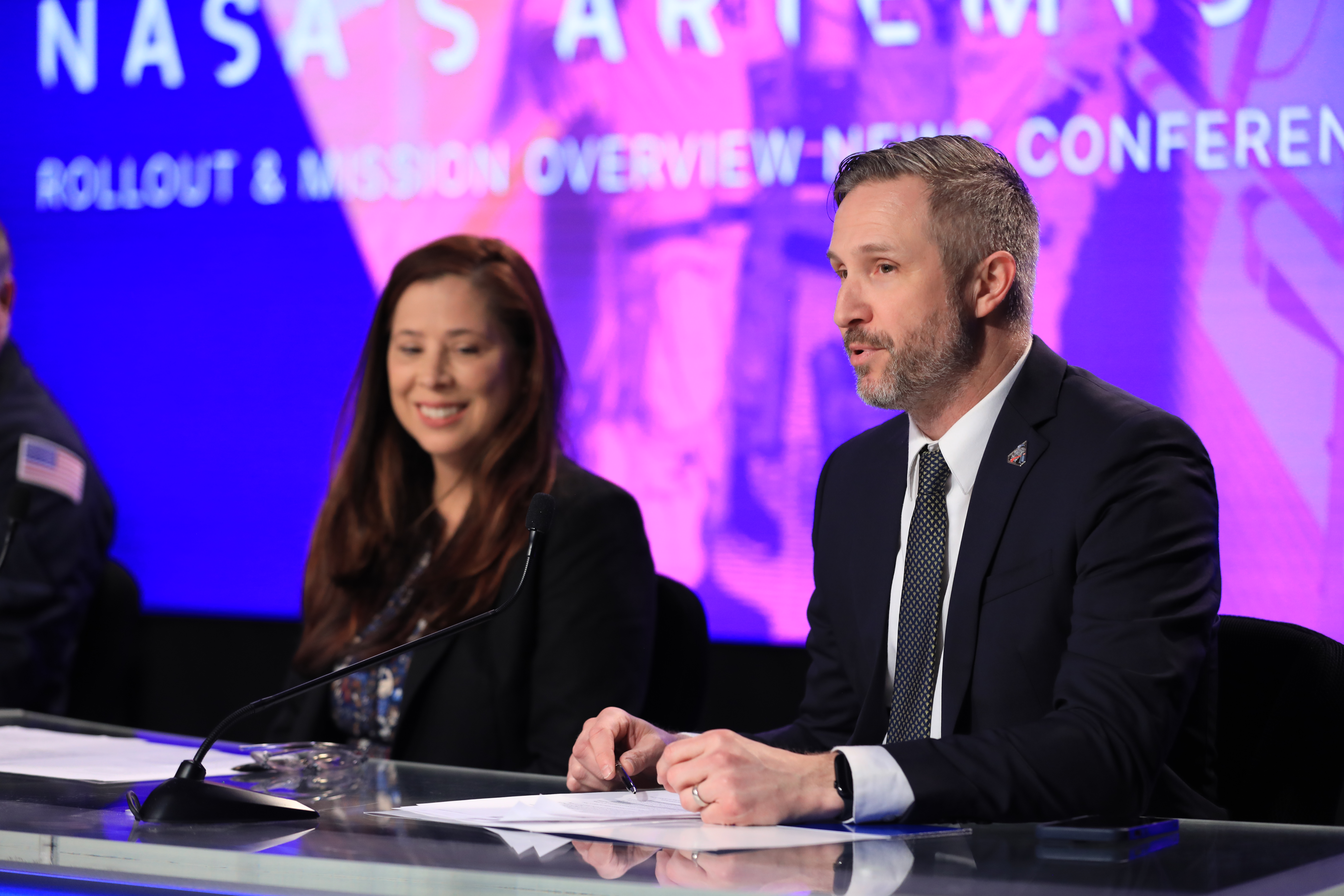 From left, Lili Villarreal, Artemis II landing and recovery director in Exploration Ground Systems Program at NASA’s Kennedy Space Center in Florida, and Jacob Bleacher, chief exploration scientist in the Exploration Systems Development Mission Directorate at NASA Headquarters in Washington, participate in an Artemis II mission overview news conference on Friday, Jan. 16, 2026, at NASA’s Kennedy Space Center in Florida ahead of rollout of the SLS (Space Launch System) rocket and Orion spacecraft from the Vehicle Assembly Building to Launch Complex 39B at NASA Kennedy. The Artemis II test flight will take Commander Reid Wiseman, Pilot Victor Glover, and Mission Specialist Christina Koch from NASA, and Mission Specialist Jeremy Hansen from the CSA (Canadian Space Agency), around the Moon and back to Earth no later than April 2026.