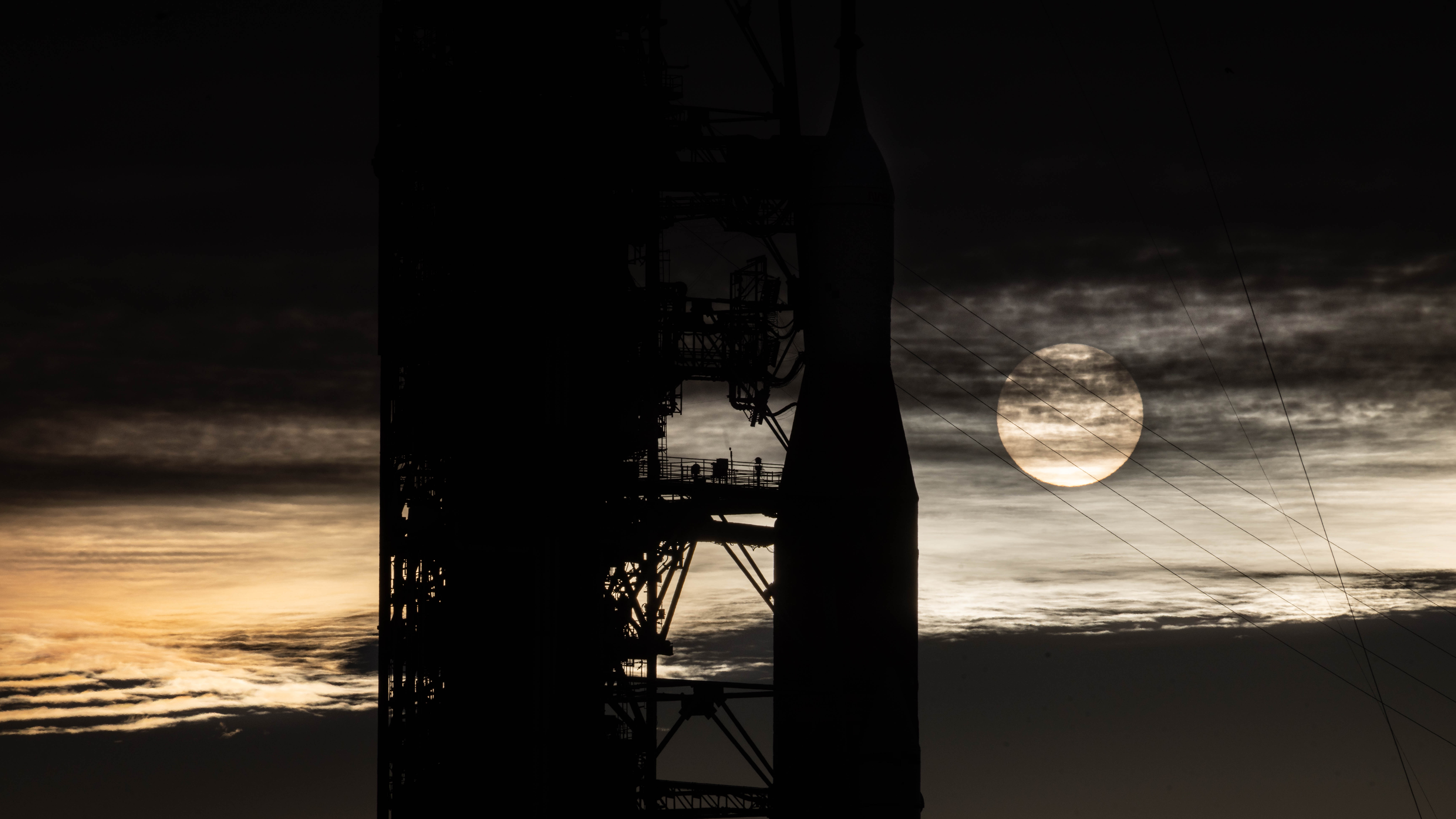 The sunrise peeks between NASA’s Artemis II SLS (Space Launch System) rocket with the Orion spacecraft atop and the mobile launcher at Launch Complex 39B at NASA’s Kennedy Space Center in Florida on Wednesday, Jan. 28, 2026. The Artemis II test flight will take Commander Reid Wiseman, Pilot Victor Glover, and Mission Specialist Christina Koch from NASA and Mission Specialist Jeremy Hansen from the CSA (Canadian Space Agency), around the Moon and back to Earth no later than April 2026.