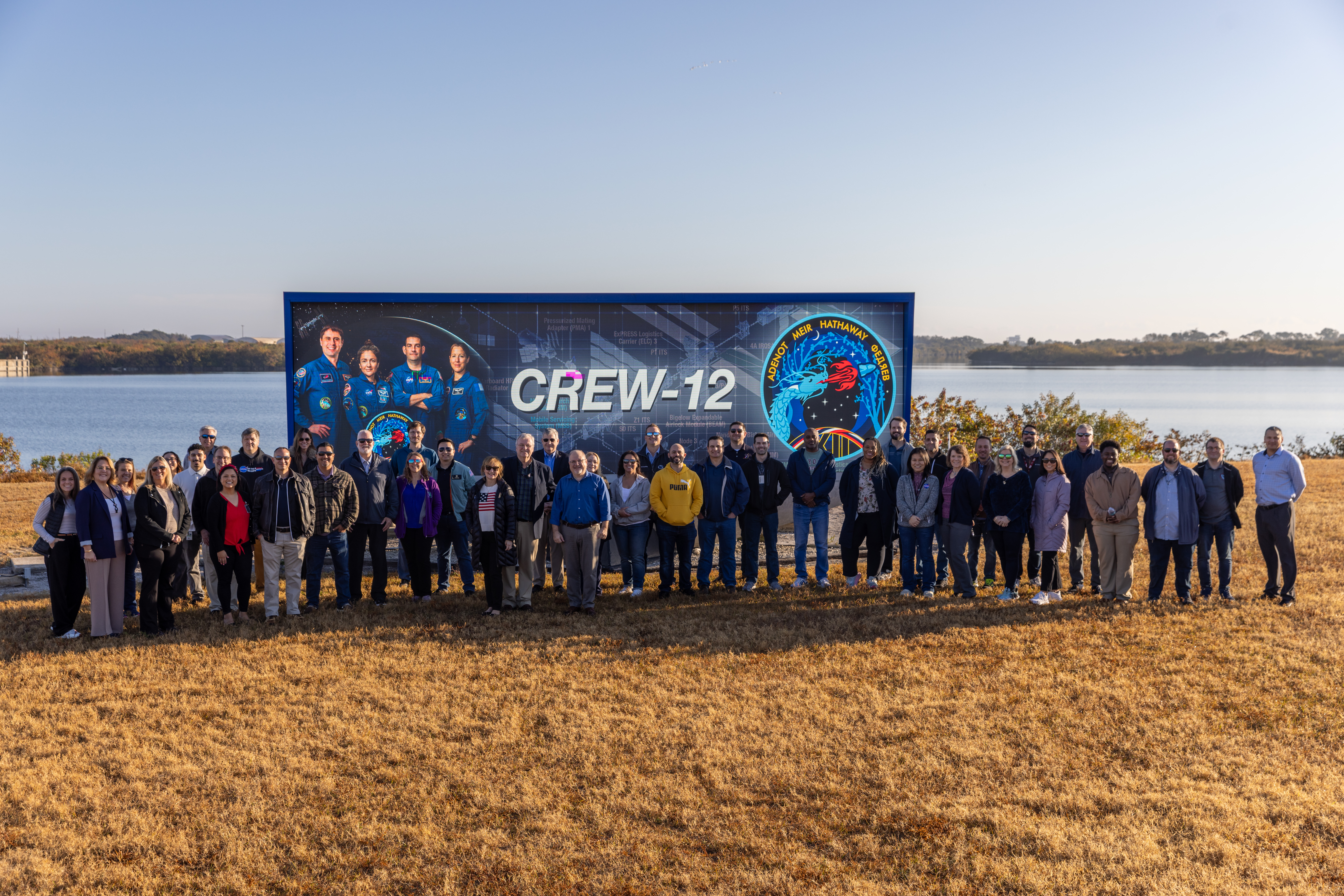 NASA Commercial Crew Program employees raise the agency’s SpaceX Crew-12 mission flag near the countdown clock at the NASA News Center at the agency’s Kennedy Space Center in Florida on Monday, Feb. 9, 2026. The Crew-12 mission will send NASA astronauts Jessica Meir and Jack Hathaway, ESA (European Space Agency) astronaut Sophie Adenot, and Roscosmos cosmonaut Andrey Fedyaev to the International Space Station aboard SpaceX’s Dragon spacecraft and Falcon 9 rocket no earlier than 5:38 a.m. EST, Thursday, Feb. 12, from Cape Canaveral Space Force Station’s Space Launch Complex 40.