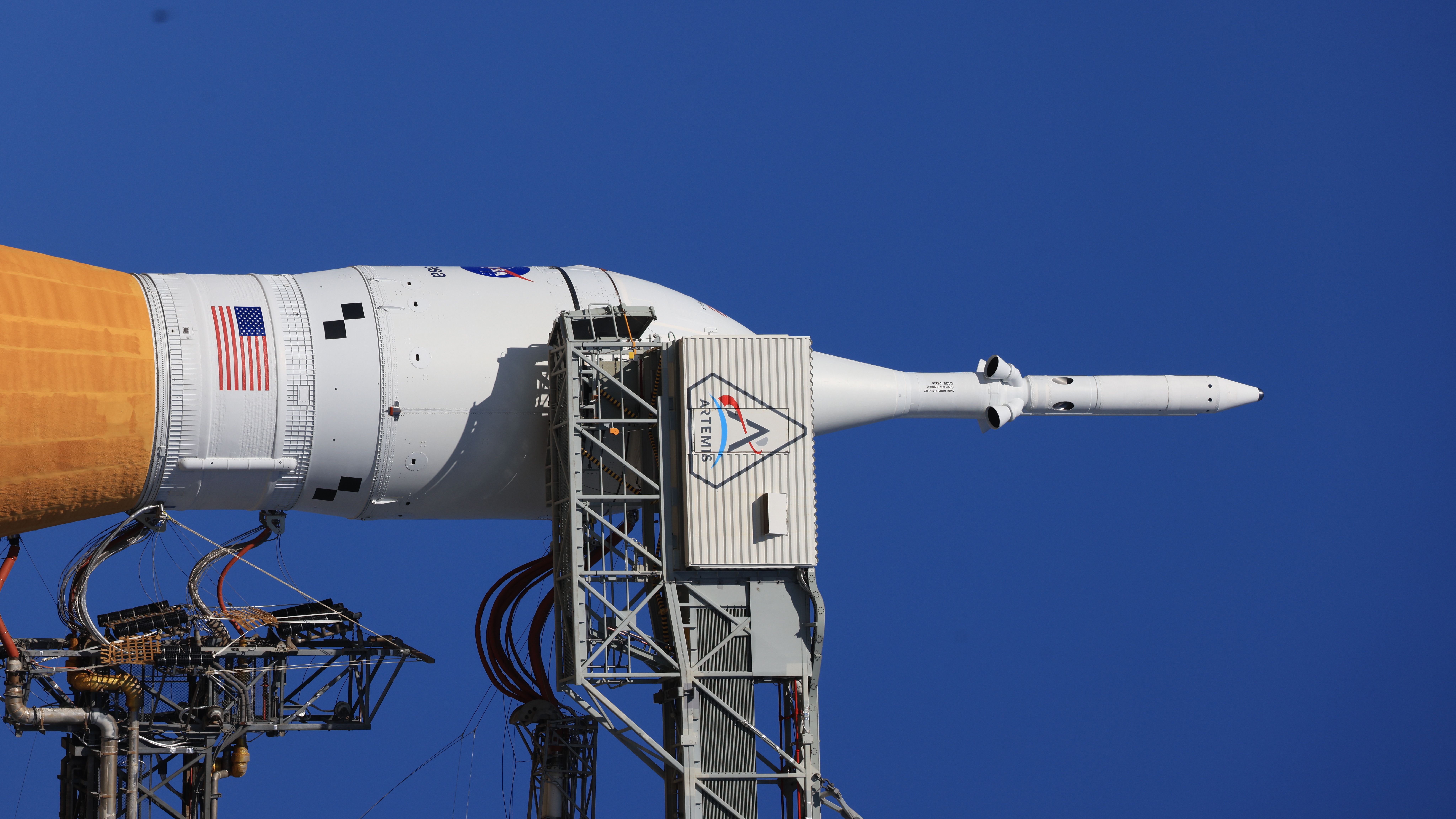 A photo shows a closeup view of the White Room connected to the crew access arm of the Orion spacecraft with launch abort system atop NASA’s Artemis II SLS (Space Launch System) rocket at Launch Complex 39B at NASA’s Kennedy Space Center in Florida on Tuesday, Feb. 10, 2026. The White Room is the small, environmentally controlled area where Artemis II Commander Reid Wiseman, Pilot Victor Glover, and Mission Specialist Christina Koch from NASA, and Mission Specialist Jeremy Hansen from the CSA (Canadian Space Agency) will make final preparations before climbing into the Orion spacecraft for launch of the Artemis II test flight.
