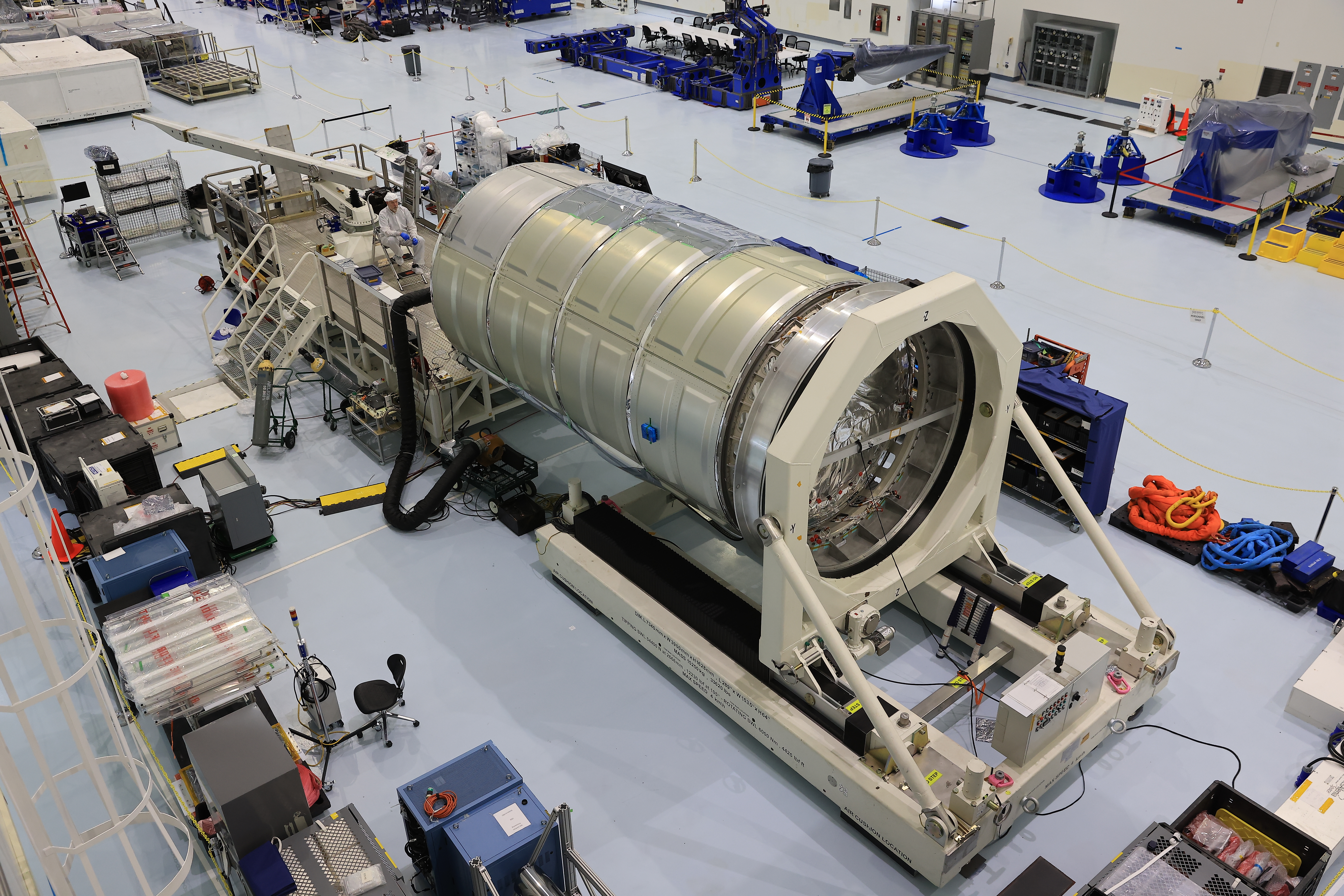 Technicians conduct prelaunch operations on Northrop Grumman Cygnus XL spacecraft’s pressurized cargo module on Monday, Feb. 23, 2026, inside the Space Systems Processing Facility at NASA’s Kennedy Space Center in Florida. The Cygnus capsule will carry supplies, food, and scientific experiments for crew members at the International Space Station as part of the company’s 24th cargo resupply mission for NASA. The mission is targeting launch no earlier than Wednesday, April 8, from Space Launch Complex 40 at Cape Canaveral Space Force Station in Florida.