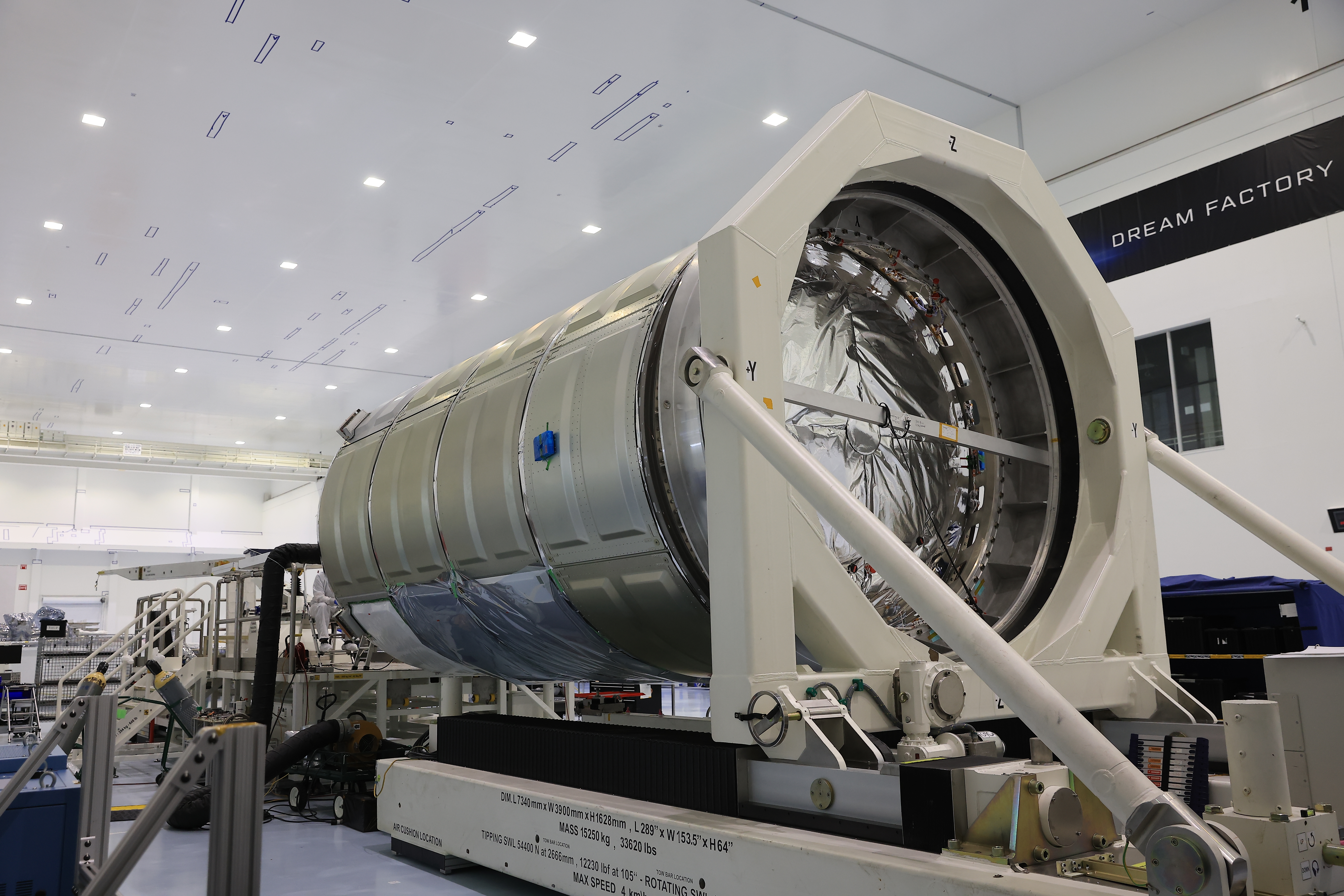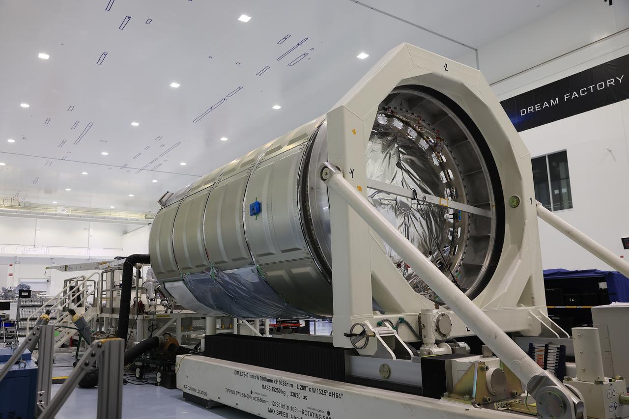 Technicians conduct prelaunch operations on Northrop Grumman Cygnus XL spacecraft’s pressurized cargo module on Monday, Feb. 23, 2026, inside the Space Systems Processing Facility at NASA’s Kennedy Space Center in Florida. The Cygnus capsule will carry supplies, food, and scientific experiments for crew members at the International Space Station as part of the company’s 24th cargo resupply mission for NASA. The mission is targeting launch no earlier than Wednesday, April 8, from Space Launch Complex 40 at Cape Canaveral Space Force Station in Florida.