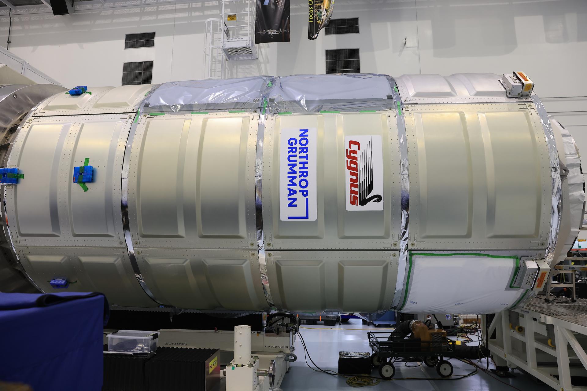 Technicians conduct prelaunch operations on Northrop Grumman Cygnus XL spacecraft’s pressurized cargo module on Monday, Feb. 23, 2026, inside the Space Systems Processing Facility at NASA’s Kennedy Space Center in Florida. The Cygnus capsule will carry supplies, food, and scientific experiments for crew members at the International Space Station as part of the company’s 24th cargo resupply mission for NASA. The mission is targeting launch no earlier than Wednesday, April 8, from Space Launch Complex 40 at Cape Canaveral Space Force Station in Florida.