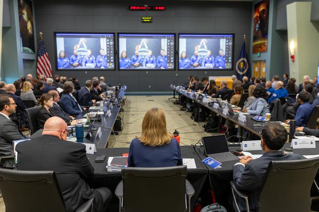 NASA leadership, with Artemis II astronauts Christina Koch, Victor Glover, Reid Wiseman, and CSA (Canadian Space Agency) Jeremy Hansen joining virtually, participate in the Artemis II Flight Readiness Review on Wednesday, March 11, 2026, at NASA’s Kennedy Space Center in Florida. The review is an assessment of the readiness of NASA’s SLS (Space Launch System) rocket and Orion spacecraft to support the Artemis II test flight as four astronauts journey around the Moon and return to Earth.