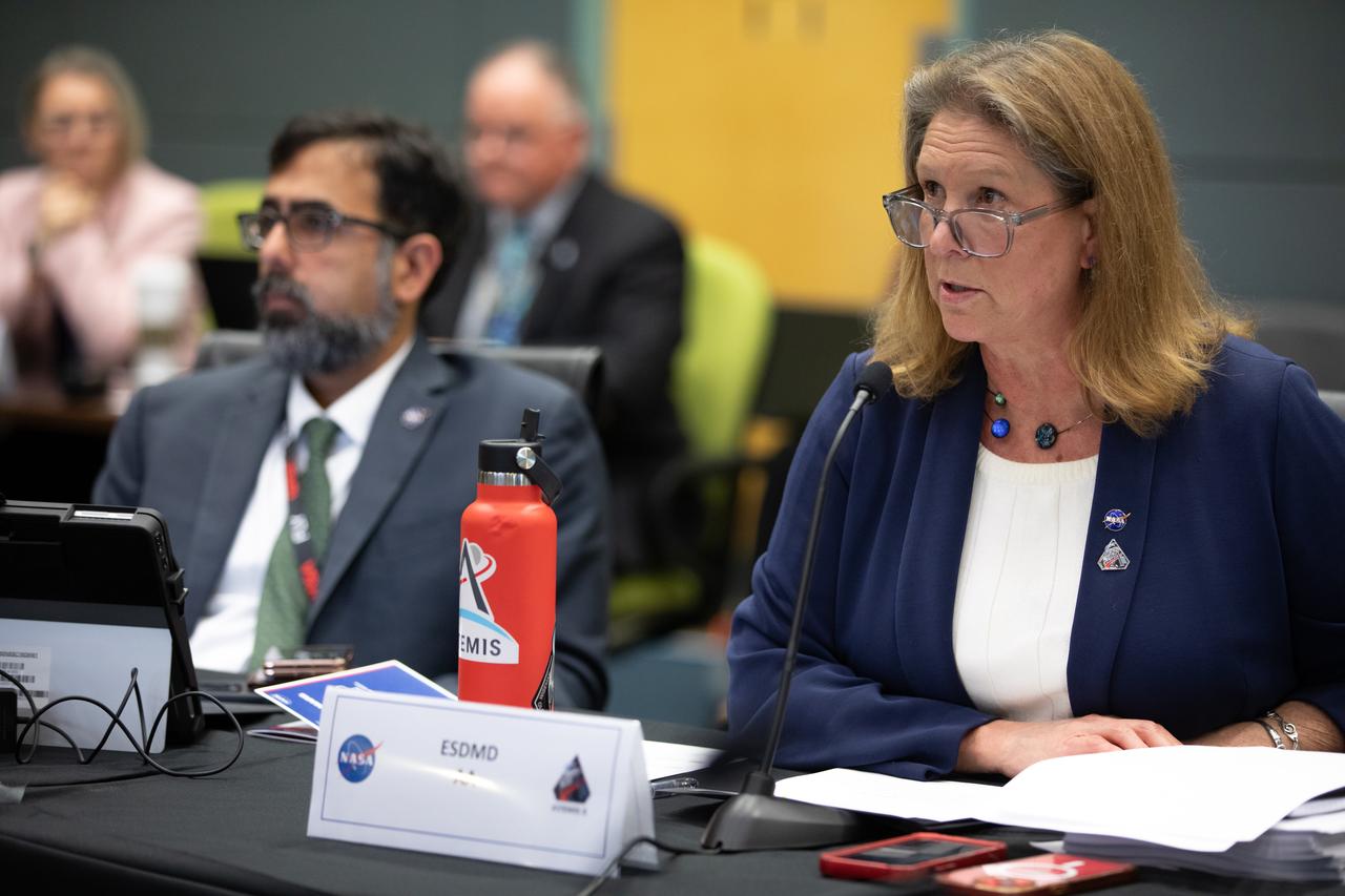 From left, NASA Associate Administrator Amit Kshatriya and Lori Glaze, acting associate administrator, Exploration Systems Development Mission Directorate, participate in the Artemis II Flight Readiness Review with NASA leadership on Wednesday, March 11, 2026, at NASA’s Kennedy Space Center in Florida. The review is an assessment of the readiness of NASA’s SLS (Space Launch System) rocket and Orion spacecraft to support the Artemis II test flight as four astronauts journey around the Moon and return to Earth.