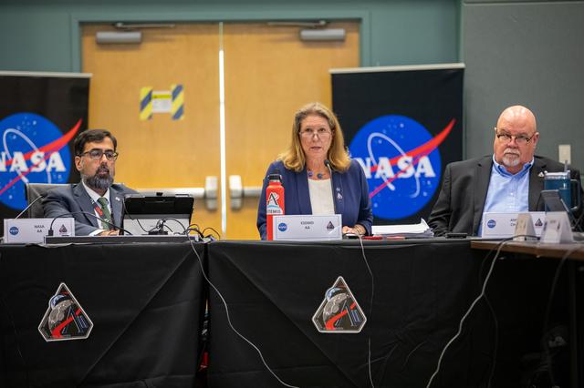 From left, NASA Associate Administrator Amit Kshatriya; Lori Glaze, acting associate administrator, Exploration Systems Development Mission Directorate; and John Honeycutt, chair, Artemis II mission management team, participate in the Artemis II Flight Readiness Review with NASA leadership on Wednesday, March 11, 2026, at NASA’s Kennedy Space Center in Florida. The review is an assessment of the readiness of NASA’s SLS (Space Launch System) rocket and Orion spacecraft to support the Artemis II test flight as four astronauts journey around the Moon and return to Earth.