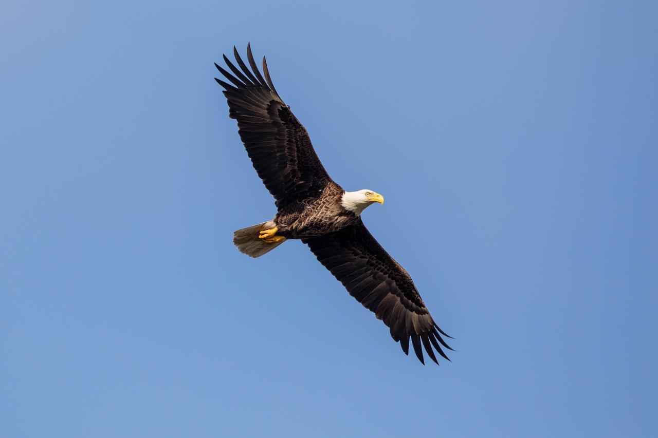 An American bald eagles flies away from their nest and tree at NASA’s Kennedy Space Center in Florida on Friday, March 13, 2026. Bald eagle nesting surveys across NASA Kennedy, Merritt Island National Wildlife Refuge, and Canaveral National Seashore are conducted annually to document the number of bald eagle active and inactive nests in support of wildlife management and regulatory compliance. Each year, eagles take up winter residence at the Florida spaceport, breeding and raising a new generation.