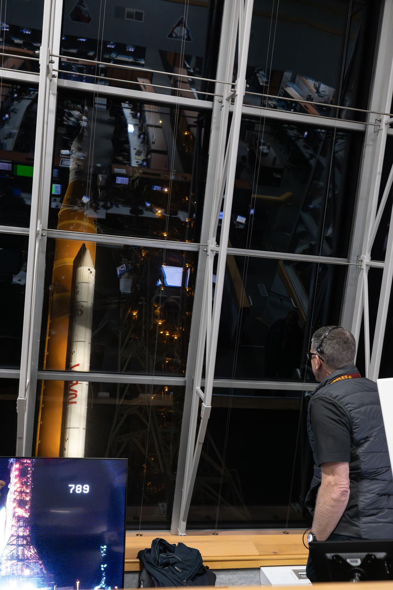 Jeremy Graeber, assistant launch director, watch inside Firing Room 1 of the Rocco A. Petrone Launch Control Center the Artemis II rollout of the SLS (Space Launch System) rocket and Orion spacecraft from the Vehicle Assembly Building to Launch Complex 39B at NASA’s Kennedy Space Center in Florida on Friday, March 20, 2026. The Artemis II test flight will take Commander Reid Wiseman, Pilot Victor Glover, and Mission Specialist Christina Koch from NASA, and Mission Specialist Jeremy Hansen from the CSA (Canadian Space Agency), around the Moon and back to Earth with launch opportunities beginning in April 2026.