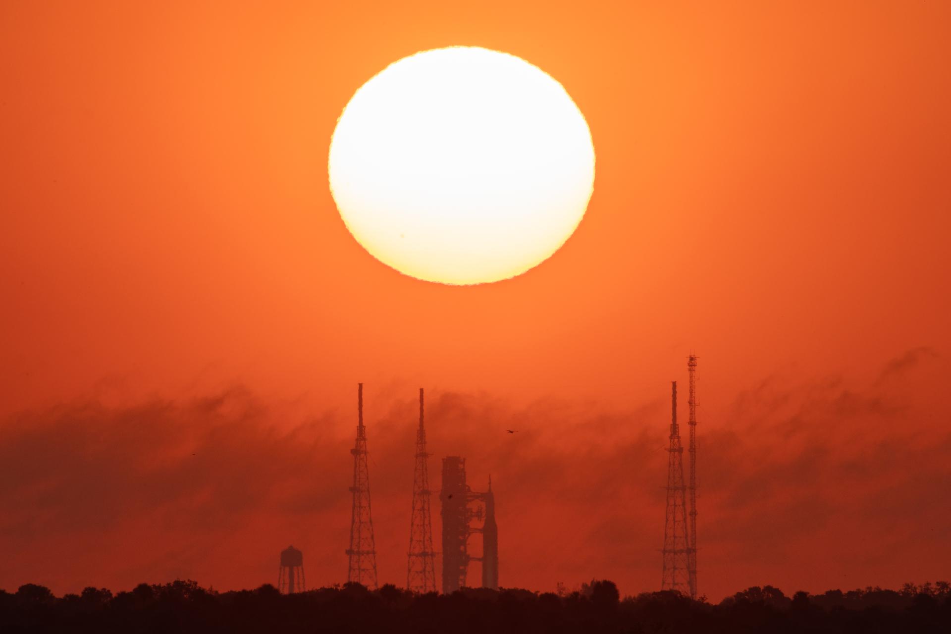 The rising Sun illuminates the sky on Tuesday, March 24, 2026, as NASA’s Artemis II SLS (Space Launch System) rocket and Orion spacecraft stand vertical at Launch Complex 39B at NASA’s Kennedy Space Center in Florida. The Artemis II test flight will take Commander Reid Wiseman, Pilot Victor Glover, and Mission Specialist Christina Koch from NASA, and Mission Specialist Jeremy Hansen from the CSA (Canadian Space Agency), around the Moon and back to Earth with launch opportunities beginning in April 2026.
