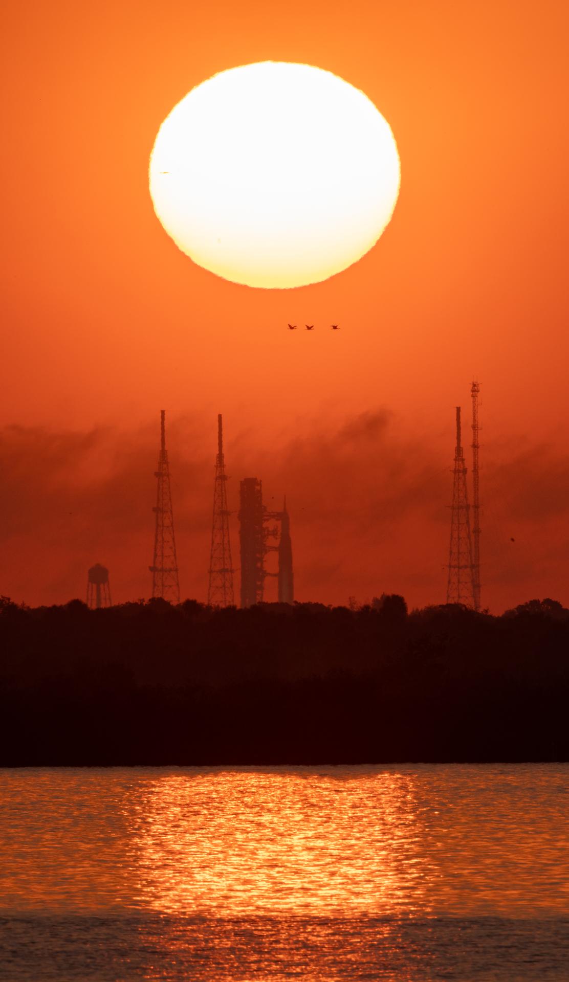 The rising Sun illuminates the sky on Tuesday, March 24, 2026, as NASA’s Artemis II SLS (Space Launch System) rocket and Orion spacecraft stand vertical at Launch Complex 39B at NASA’s Kennedy Space Center in Florida. The Artemis II test flight will take Commander Reid Wiseman, Pilot Victor Glover, and Mission Specialist Christina Koch from NASA, and Mission Specialist Jeremy Hansen from the CSA (Canadian Space Agency), around the Moon and back to Earth with launch opportunities beginning in April 2026.
