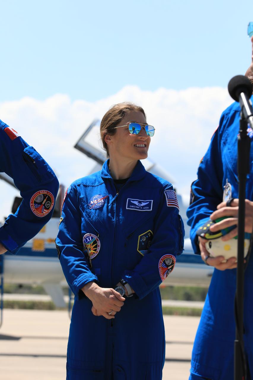NASA Artemis II Mission Specialist Christina Koch arrives on Friday, March 27, 2026, at the Launch and Landing Facility at the agency’s Kennedy Space Center in Florida in preparation for the Artemis II test flight. Koch, Commander Reid Wiseman, and Pilot Victor Glover from NASA, and Mission Specialist Jeremy Hansen from the CSA (Canadian Space Agency) will launch on a 10-day journey around the Moon and back aboard the agency’s SLS (Space Launch System) rocket and Orion spacecraft from Launch Complex 39B no earlier than 6:24 p.m. EDT on Wednesday, April 1.