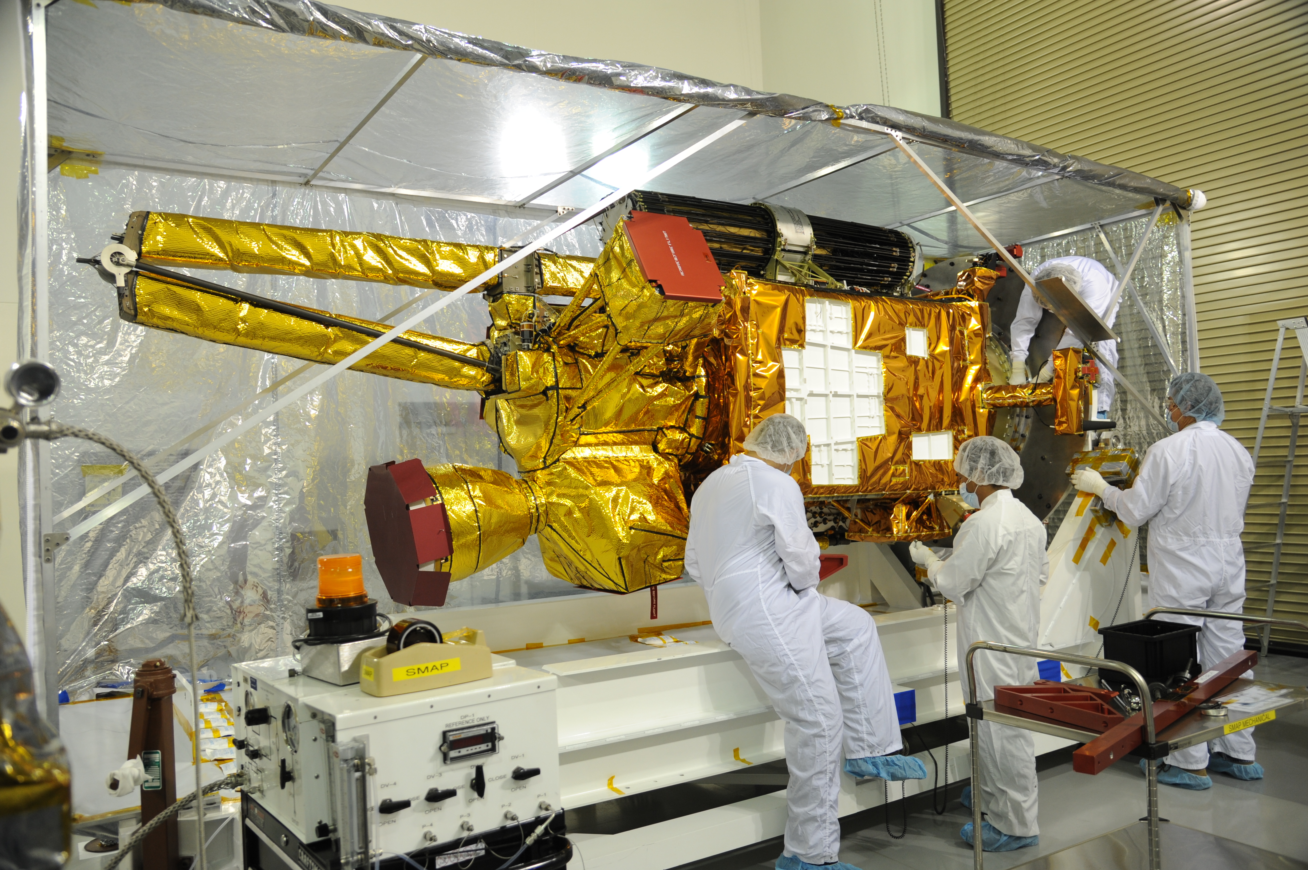Workers inspect NASA's Soil Moisture Active Passive, or SMAP, spacecraft after its protective covering is removed in the Astrotech payload processing facility on Vandenberg Air Force Base in California during a post-shipment inspection. The covering protected the spacecraft from static-charge buildup and contamination while it was in transit from NASA's Jet Propulsion Laboratory in Pasadena, California. SMAP will launch on a Delta II 7320 configuration vehicle featuring a United Launch Alliance first stage booster powered by an Aerojet Rocketdyne RS-27A main engine and three Alliant Techsystems, or ATK, strap-on solid rocket motors. Once on station in Earth orbit, SMAP will provide global measurements of soil moisture and its freeze/thaw state. These measurements will be used to enhance understanding of processes that link the water, energy and carbon cycles, and to extend the capabilities of weather and climate prediction models. SMAP data also will be used to quantify net carbon flux in boreal landscapes and to develop improved flood prediction and drought monitoring capabilities. Launch from Space Launch Complex 2 is targeted for Jan. 29, 2015.