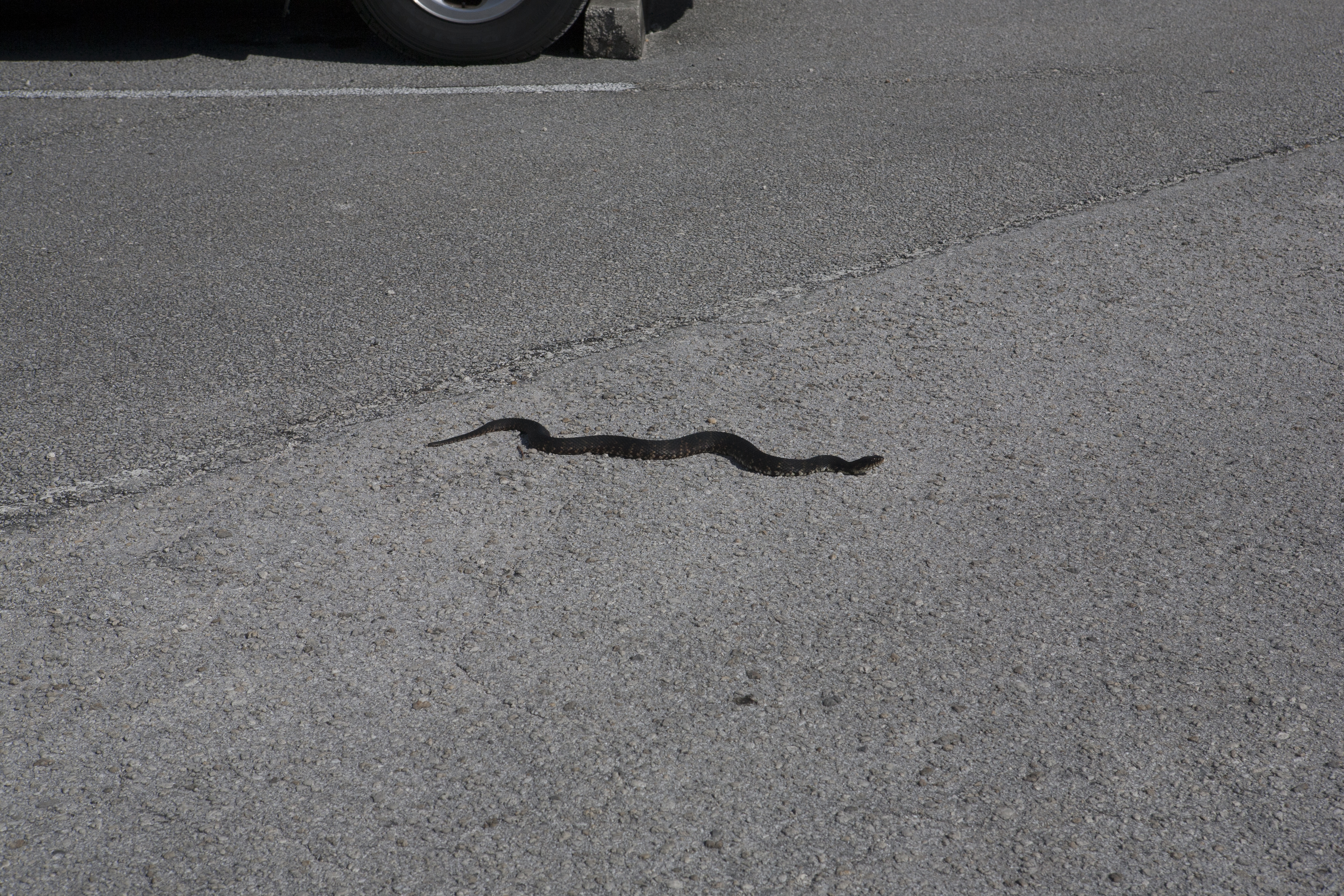 A water moccasin snake travels across the gravel surface near the Mobile Launcher, or ML, at the Mobile Launcher Park Site at NASA’s Kennedy Space Center in Florida. Nearby, the haunch, a structure that will support the launch vehicle on the ML, arrives by flatbed truck at the park site. The ML is being modified and strengthened to accommodate the weight, size and thrust at launch of NASA's Space Launch System, or SLS, and Orion spacecraft. In 2013, the agency awarded a contract to J.P. Donovan Construction Inc. of Rockledge, Fla., to modify the ML, which is one of the key elements of ground support equipment that is being upgraded by the Ground Systems Development and Operations Program at Kennedy. The existing 24-foot exhaust hole is being enlarged and strengthened for the larger, heavier SLS rocket. The ML will carry the SLS rocket and Orion spacecraft to Launch Pad 39B for its first uncrewed mission, Exploration Mission-1, in 2018.
