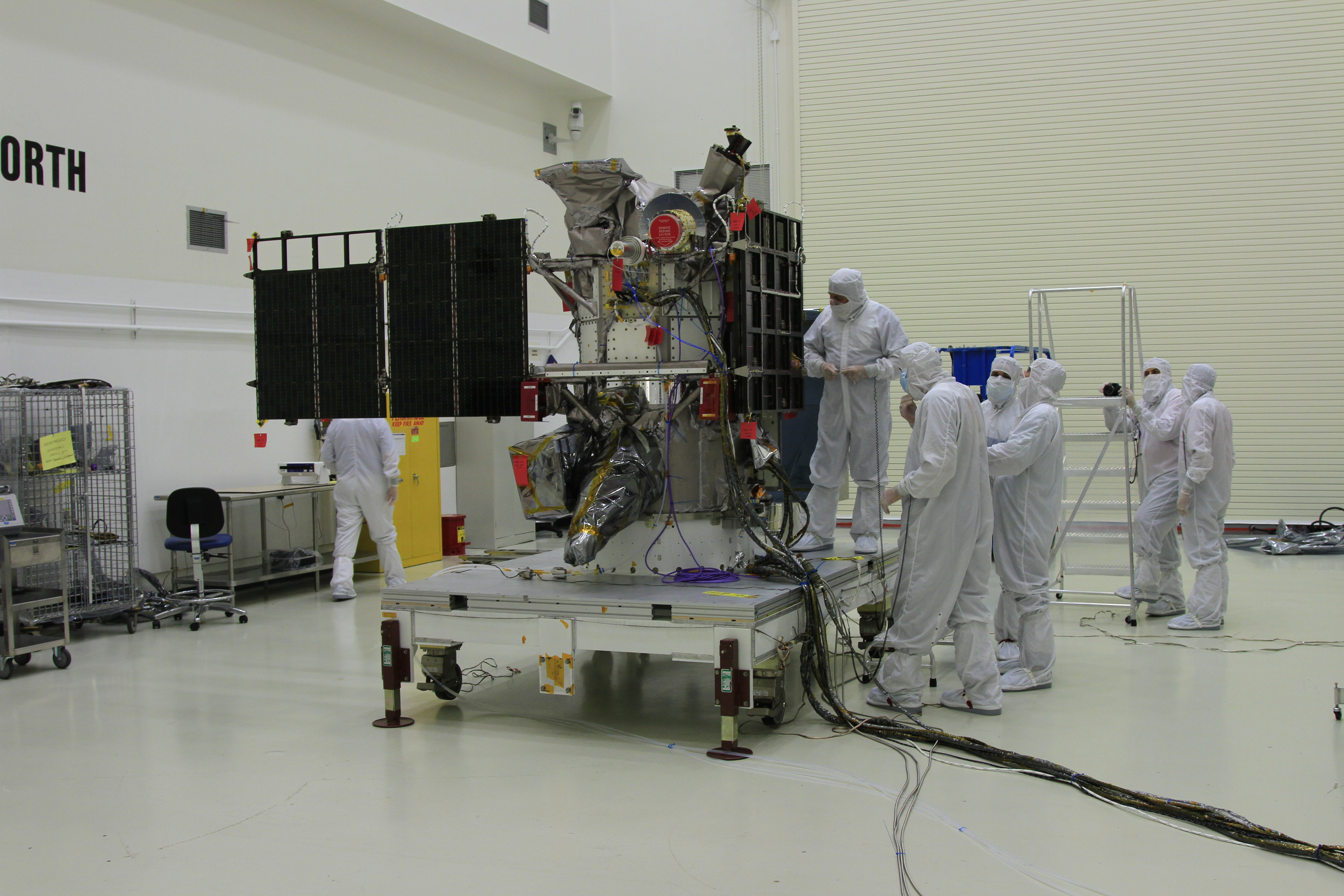 Workers deploy the solar arrays on NOAA’s Deep Space Climate Observatory spacecraft, or DSCOVR, in the Building 1 high bay at the Astrotech payload processing facility in Titusville, Florida, near Kennedy Space Center. DSCOVR is a partnership between NOAA, NASA and the U.S. Air Force. DSCOVR will maintain the nation's real-time solar wind monitoring capabilities which are critical to the accuracy and lead time of NOAA's space weather alerts and forecasts. Launch is targeted for early 2015 aboard a SpaceX Falcon 9 v 1.1 launch vehicle from Cape Canaveral Air Force Station, Florida.
