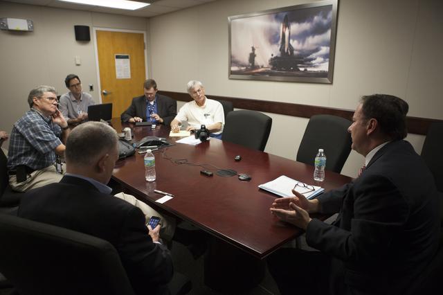 Journalists listen as NASA Associate Administrator Robert Lightfoot provides information on the Asteroid Redirect Mission during a roundtable discussion at the agency's Kennedy Space Center in Florida.