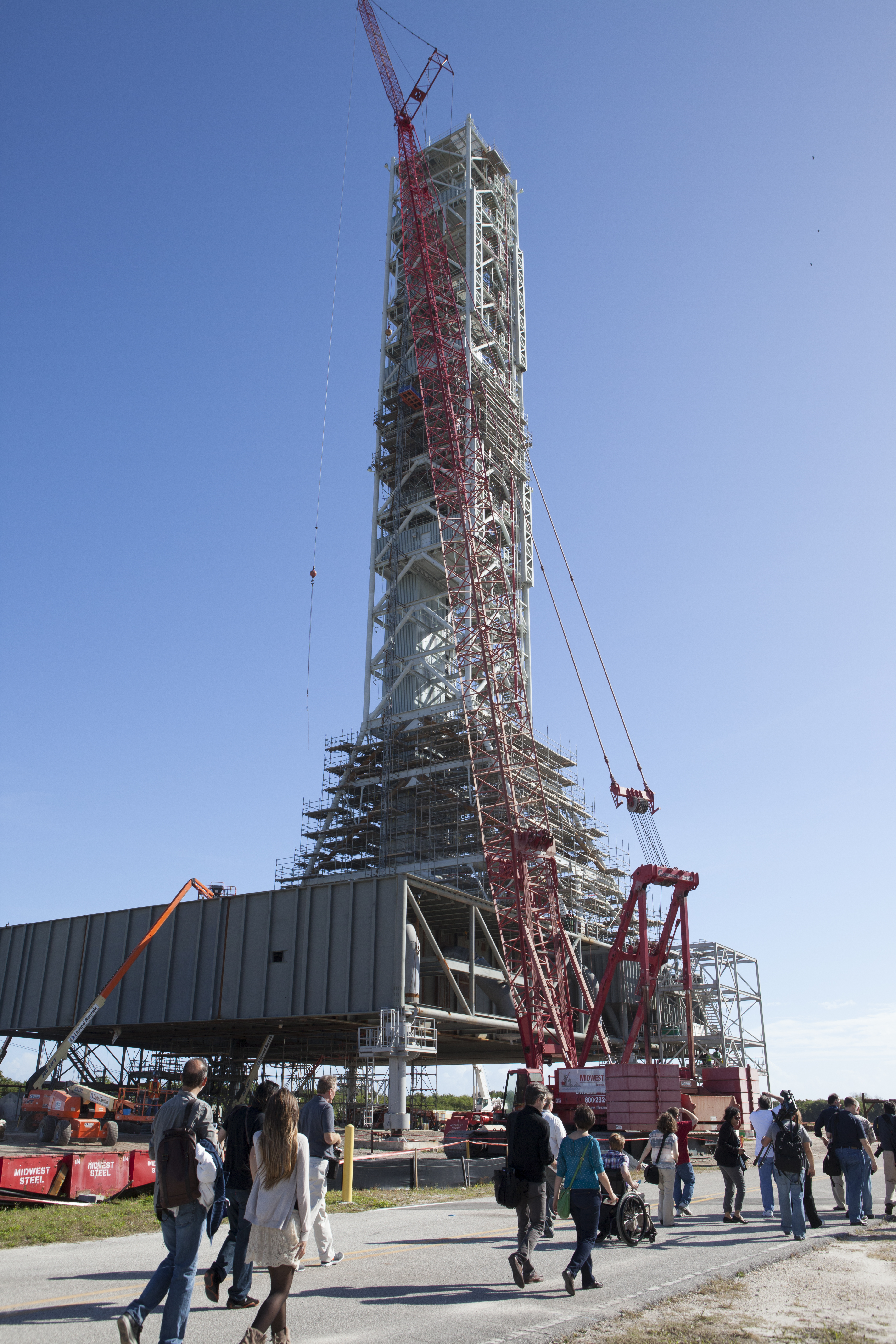 At NASA's Kennedy Space Center in Florida, members of the news media get an up-close look at the new mobile launcher. The Space Launch System rocket will be stacked on the launcher inside the Vehicle Assembly Building prior to rollout to Launch Pad 39B atop crawler-transporter 2. Orion is the exploration spacecraft designed to carry astronauts to destinations not yet explored by humans, including an asteroid and Mars. It will have emergency abort capability, sustain the crew during space travel and provide safe re-entry from deep space return velocities. The first unpiloted flight test of Orion is scheduled to launch Dec. 4, 2014 atop a United Launch Alliance Delta IV Heavy rocket, and in 2018 on NASA’s Space Launch System rocket.