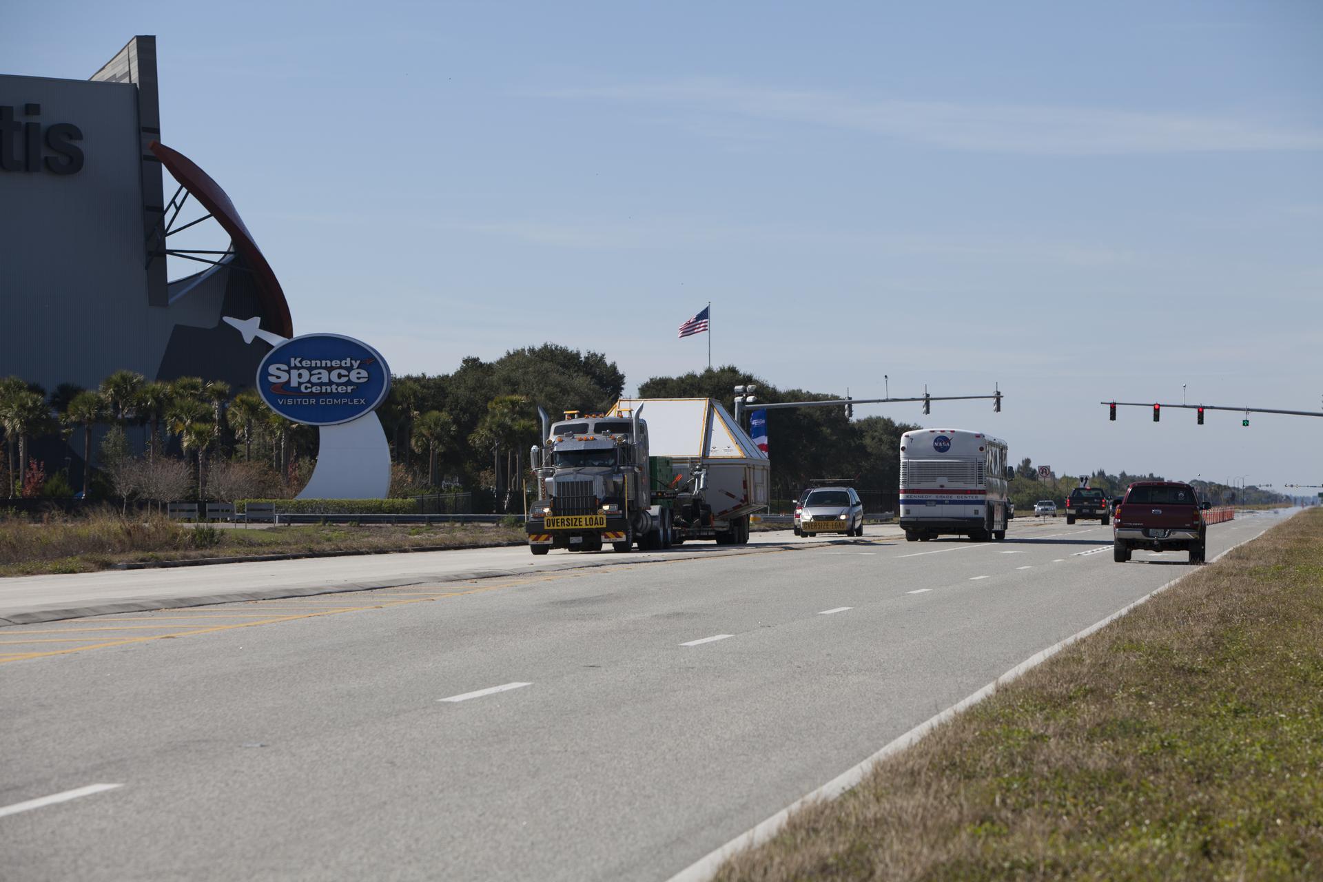 NASA's Orion crew module, enclosed in its crew module transportation fixture and secured on a flatbed truck passes by the Space Shuttle Atlantis building at the Kennedy Space Center Visitor Complex on its way to the entrance gate to Kennedy Space Center in Florida. Orion made the overland trip from Naval Base San Diego in California. Orion was recovered from the Pacific Ocean after completing a two-orbit, four-and-a-half hour mission Dec. 5 to test systems critical to crew safety, including the launch abort system, the heat shield and the parachute system. The Ground Systems Development and Operations Program led the recovery, offload and transportation efforts.