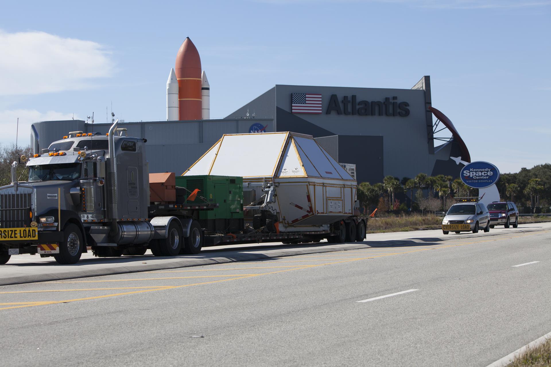 NASA's Orion crew module, enclosed in its crew module transportation fixture and secured on a flatbed truck passes by the Space Shuttle Atlantis building at the Kennedy Space Center Visitor Complex on its way to the entrance gate to Kennedy Space Center in Florida. Orion made the overland trip from Naval Base San Diego in California. Orion was recovered from the Pacific Ocean after completing a two-orbit, four-and-a-half hour mission Dec. 5 to test systems critical to crew safety, including the launch abort system, the heat shield and the parachute system. The Ground Systems Development and Operations Program led the recovery, offload and transportation efforts.