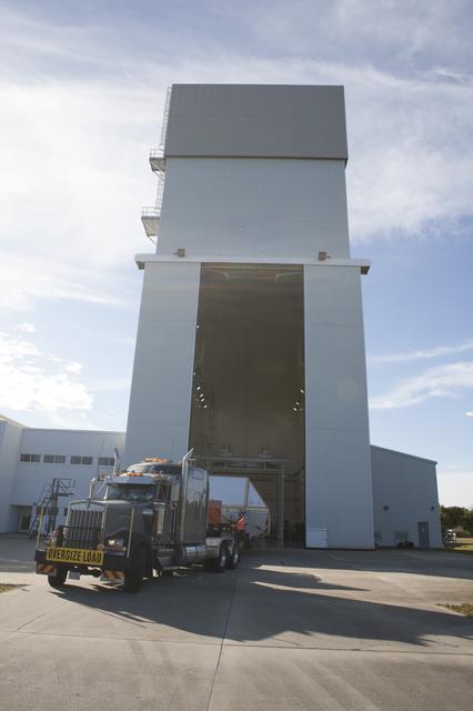 NASA's Orion spacecraft arrives at the Launch Abort System Facility at Kennedy Space Center in Florida. The spacecraft was transported 2,700 miles overland from Naval Base San Diego in California, on a flatbed truck secured in its crew module transportation fixture for the trip. During its first flight test, Orion completed a two-orbit, four-and-a-half hour mission Dec. 5 to test systems critical to crew safety, including the launch abort system, the heat shield and the parachute system. The Ground Systems Development and Operations Program led the recovery, offload and transportation efforts.