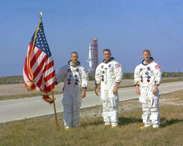 CAPE CANAVERAL, Fla. – Apollo 9 astronauts, left to right, James McDivitt, David Scott and Russell Schweickart pause in front of the Apollo/Saturn V space vehicle that will launch Apollo 8 space pilots Frank Borman, James Lovell and William Anders on a planned lunar orbital mission. The 363-foot-high space vehicle will lift off from the Kennedy Space Center's Launch Complex 39A. Gaseous liquid oxygen is venting from the vehicle's first stage during recent Countdown Demonstration Test. Photo credit: NASA