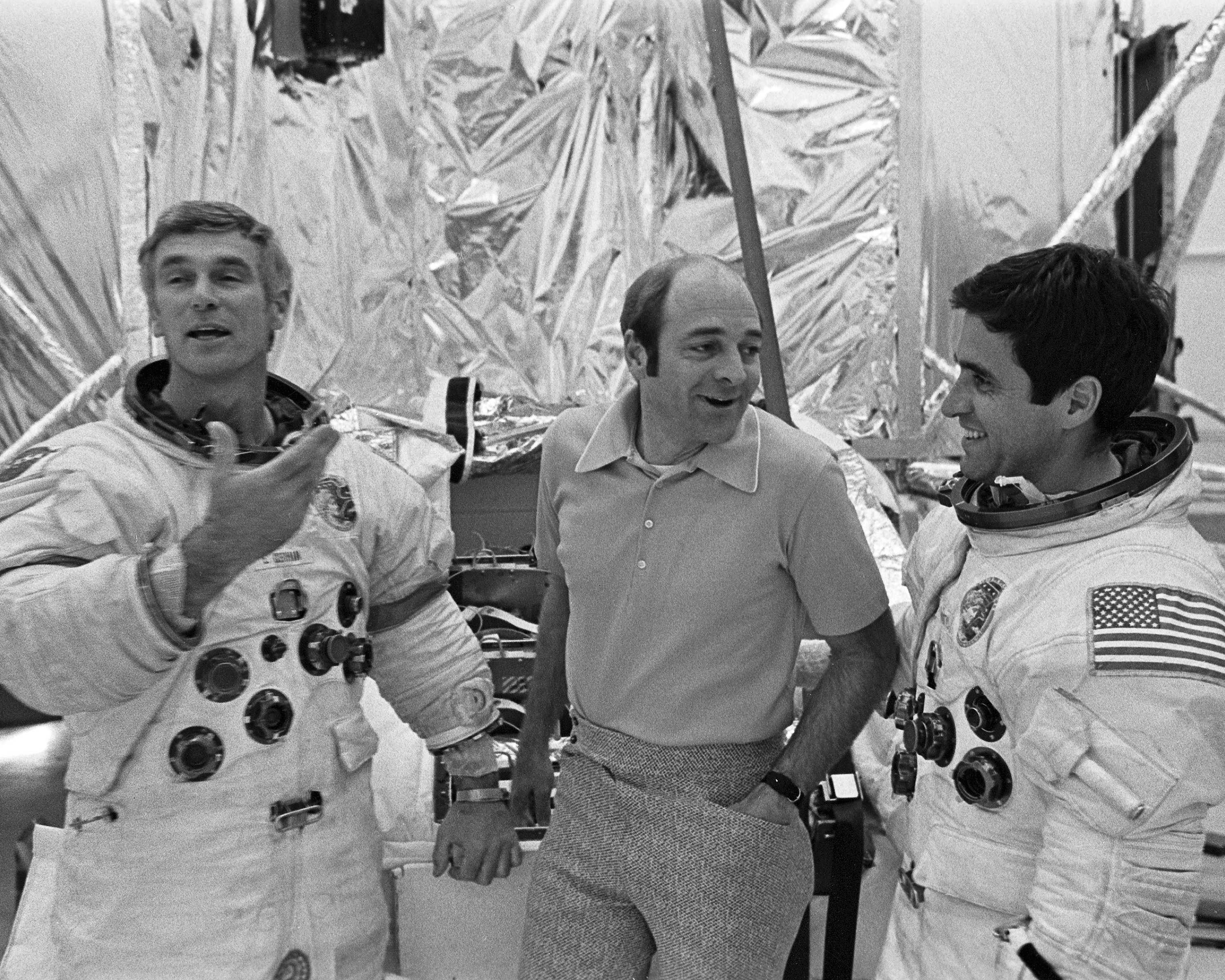 Apollo 17 Mission Commander Eugene A. Cernan, left, jokes with crewmates Ronald E. Evans, center, and Harrison H. Schmitt following training exercises today at the Florida Spaceport. Cernan and Schmitt practiced aspects of their upcoming mission in the full-scale Lunar Module Spacecraft mockup, shown in rear.