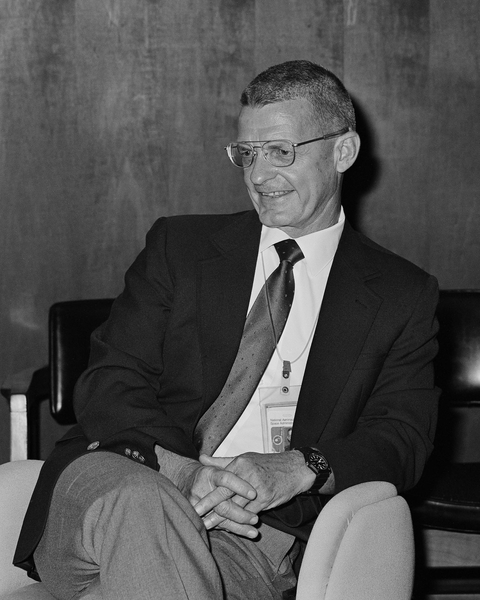 CAPE CANAVERAL, Fla. - Kennedy Space Center Director Forrest McCartney listens to NASA Administrator Dr. James Fletcher say his goodbyes to Kennedy Space Center upon his announced retirement from NASA's top position. Photo credit: NASA