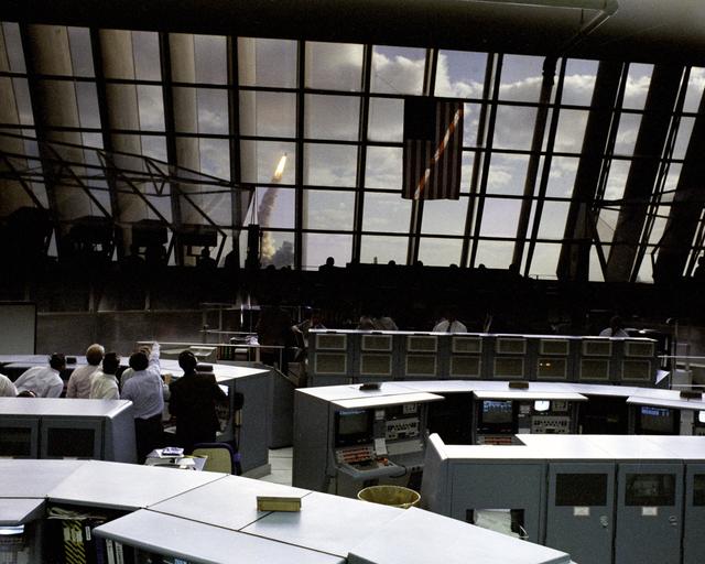 Through the large window panes of Firing Room 1, KSC launch team members reap the rewards of their work with a glimpse of the space shuttle Discovery soaring into the sky. Discovery was launched for the tenth time at 8:34 a.m. EDT on April 24 beginning the five-day STS-31 mission to deploy the Hubble Space Telescope. A ray of morning sunlight highlights the red and white stripes of Old Glory hanging high in the Firing Room. Launch team members overcame a last minute challenge in the STS-31 countdown when software detected a main propulsion system valve was out of position. The situation was quickly corrected and verified by the team from consoles in the Firing Room and the countdown was returned in a matter of minutes. Photo credit: NASA