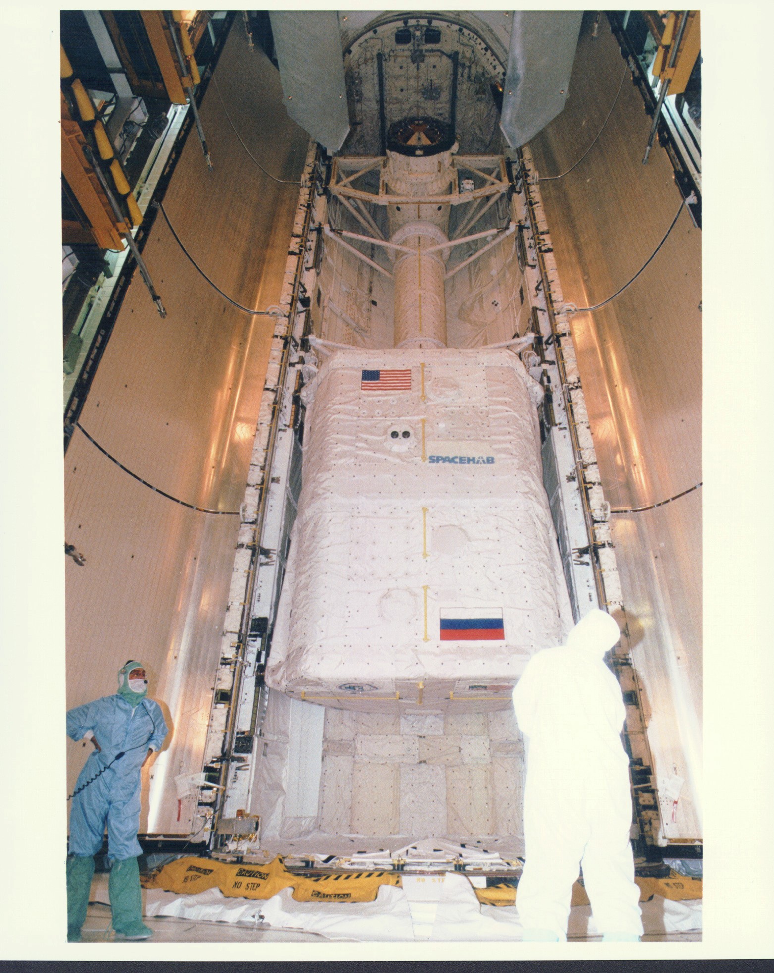 KENNEDY SPACE CENTER, FLA. - Workers in the Payload Changeout Room (PCR) at Launch Pad 39A are preparing to close the payload doors for flight on the Space Shuttle Atlantis, targeted for liftoff on Mission STS-79 around Sept. 12. The SPACEHAB Double Module located in the aft area of the payload bay is filled with supplies and other items slated for transfer to the Russian Space Station Mir. STS-79 marks the second flight of a SPACEHAB in support of the Shuttle-Mir dockings, and the first flight of the double-module configuration. The SPACEHAB is connected by tunnel to the Orbiter Docking System (ODS), with the Androgynous Peripheral Docking System (APDS) clearly visible on top of the ODS. The APDS provides the docking interface for the linkup with Mir, while the ODS provides a passageway from the orbiter to the Russian space station and the SPACEHAB.