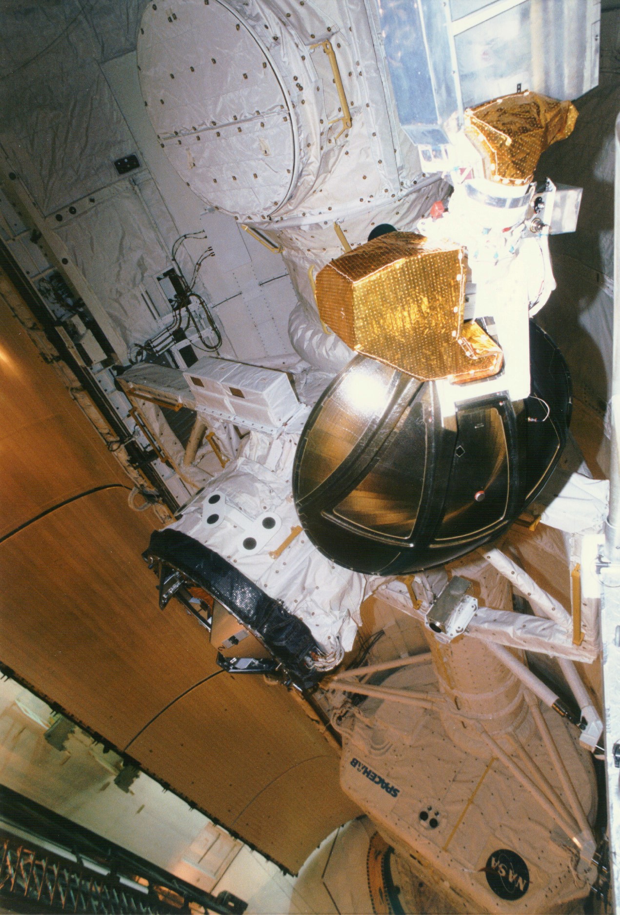 KENNEDY SPACE CENTER, FLA. - The orbiter Ku-band antenna looms large in this view of the Space Shuttle Atlantis' payload bay. Visible just past the antenna system - stowed on the starboard side of the payload bay wall - is the Orbiter Docking System (ODS), and connected to the ODS via a tunnel is the Spacehab Double Module in the aft area of the payload bay. This photograph was taken from the starboard wing platform on the fifth level of the Payload Changeout Room (PCR) at Launch Pad 39A. Work is under way in the PCR to close Atlantis' payload bay doors for flight. Atlantis currently is being targeted for liftoff on Mission STS-79, the fourth docking of the U.S. Shuttle to the Russian Space Station Mir, around Sept. 12.