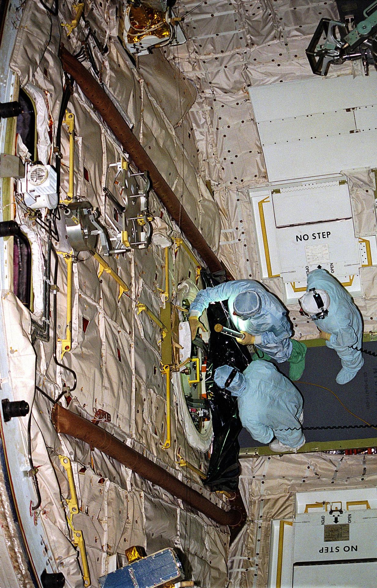 KENNEDY SPACE CENTER, FLA. -- United Space Alliance (USA) technicians in Orbiter Processing Facility Bay 1 troubleshoot the orbiter Columbia’s outer hatch of the airlock, which failed to open during the recent STS-80 Space Shuttle mission. Mission Specialists Tamara E. Jernigan and Thomas D. Jones did not perform the mission’s planned two extravehicular activities (EVAs) or spacewalks because the hatch would not open on orbit. The spacewalks were to be part of the continuing series of EVA Development Flight Tests to evaluate equipment and procedures and to build spacewalking experience in preparation for the International Space Station.
