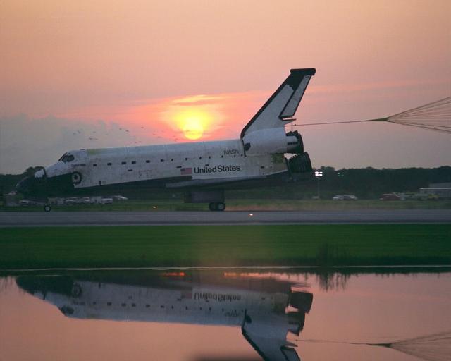 KENNEDY SPACE CENTER, FLA. -- With its drag chute deployed, the Space Shuttle Orbiter Columbia touches down on Runway 33 at KSC’s Shuttle Landing Facility at 6:46:34 a.m. EDT with Mission Commander James D. Halsell Jr. and Pilot Susan L. Still at the controls to complete the STS-94 mission. Also on board are Mission Specialist Donald A. Thomas, Mission Specialist Michael L. Gernhardt , Payload Commander Janice Voss, and Payload Specialists Roger K. Crouch and Gregory T. Linteris. Mission elapsed time for STS-94 was 15 days,16 hours, 44 seconds. During the Microgravity Science Laboratory-1 (MSL-1) mission, the Spacelab module was used to test some of the hardware, facilities and procedures that are planned for use on the International Space Station while the flight crew conducted combustion, protein crystal growth and materials processing experiments. This mission was a reflight of the STS-83 mission that lifted off from KSC in April of this year. That space flight was cut short due to indications of a faulty fuel cell. This was Columbia’s 11th landing at KSC and the 38th landing at the space center in the history of the Shuttle program